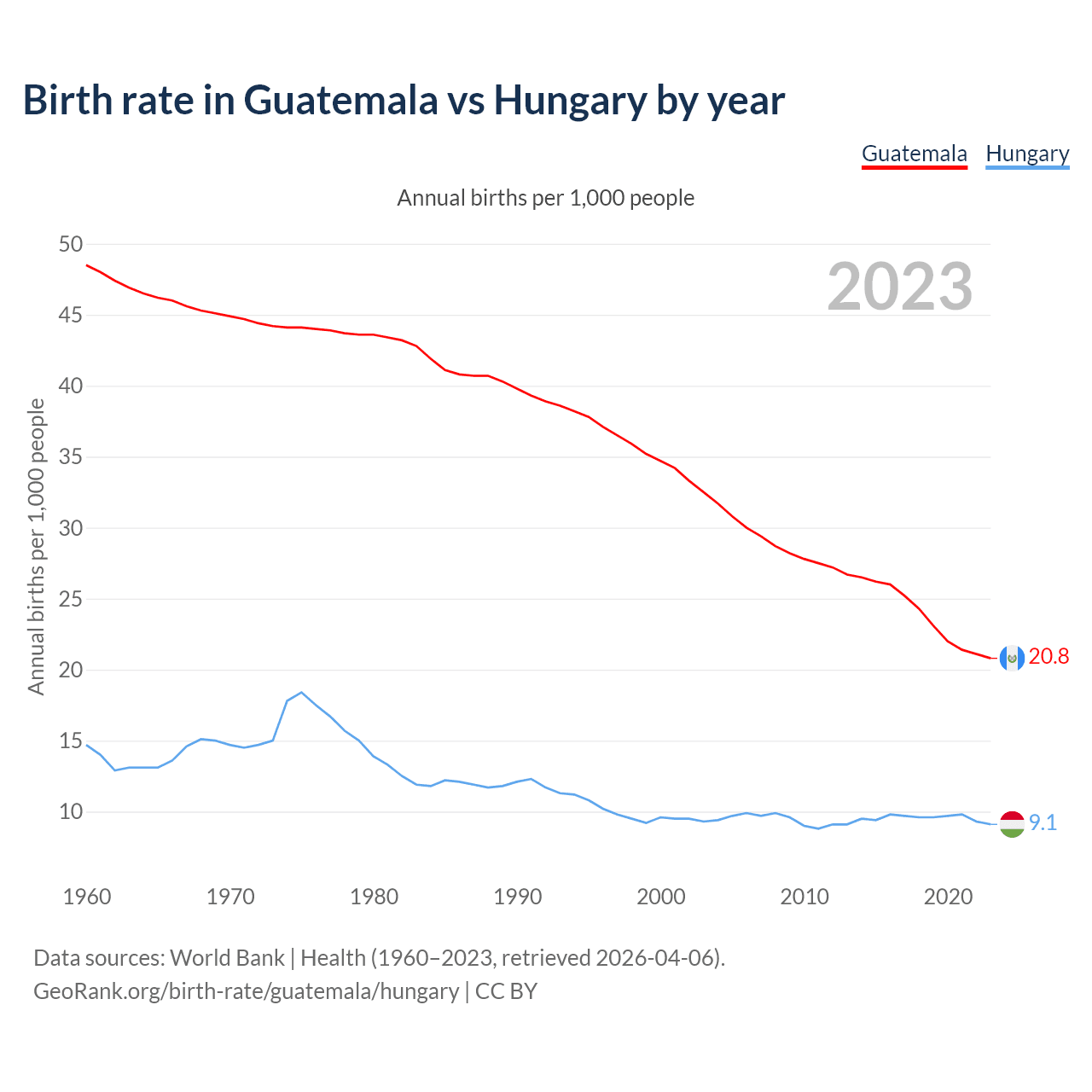 Guatemala has an annual birth rate of 20.8 births per 1,000 people, compared to 9.1 for Hungary. The average number of children a woman is expected to have during her lifetime — the fertility rate, is 2.31 in Guatemala and 1.51 in Hungary — 34.7% difference.