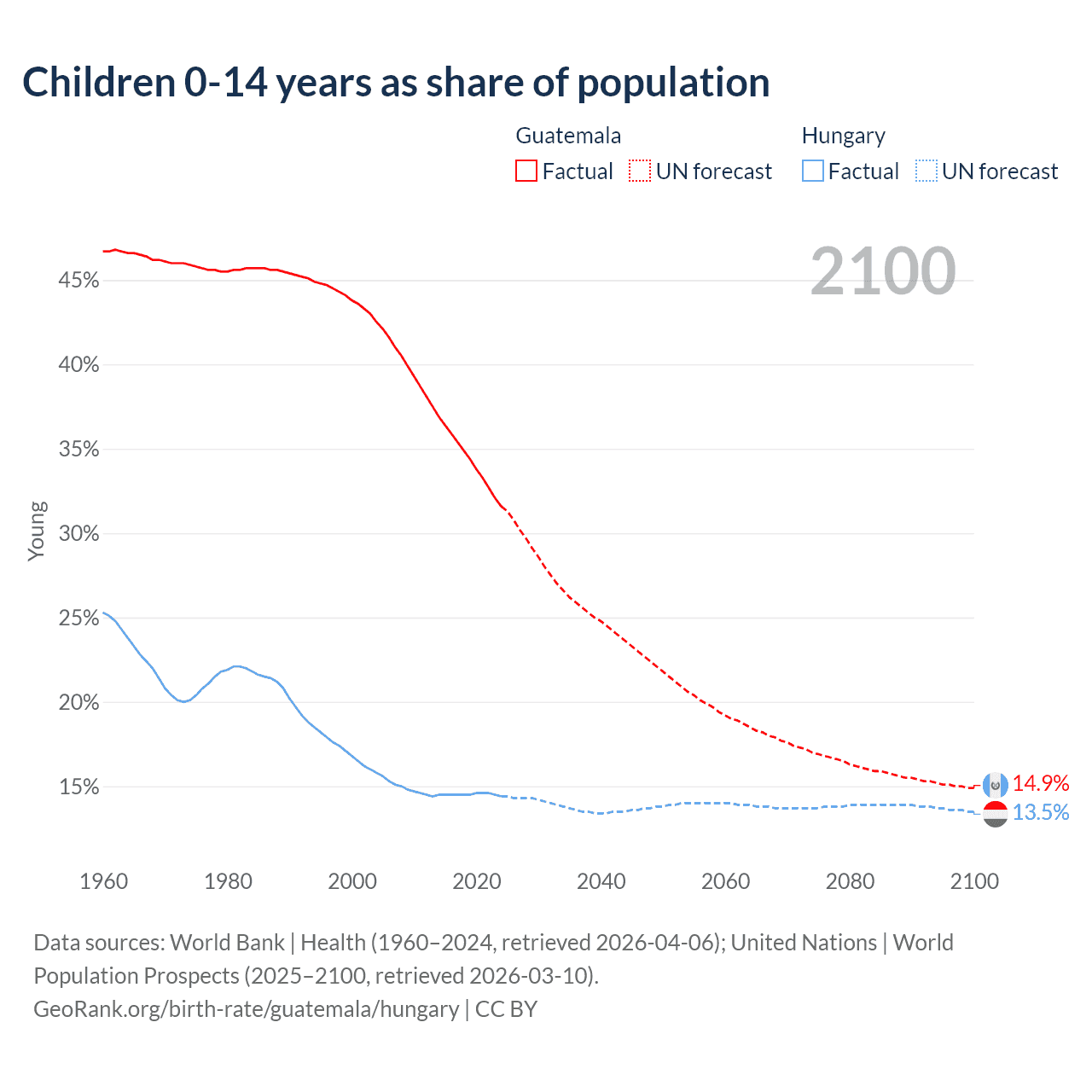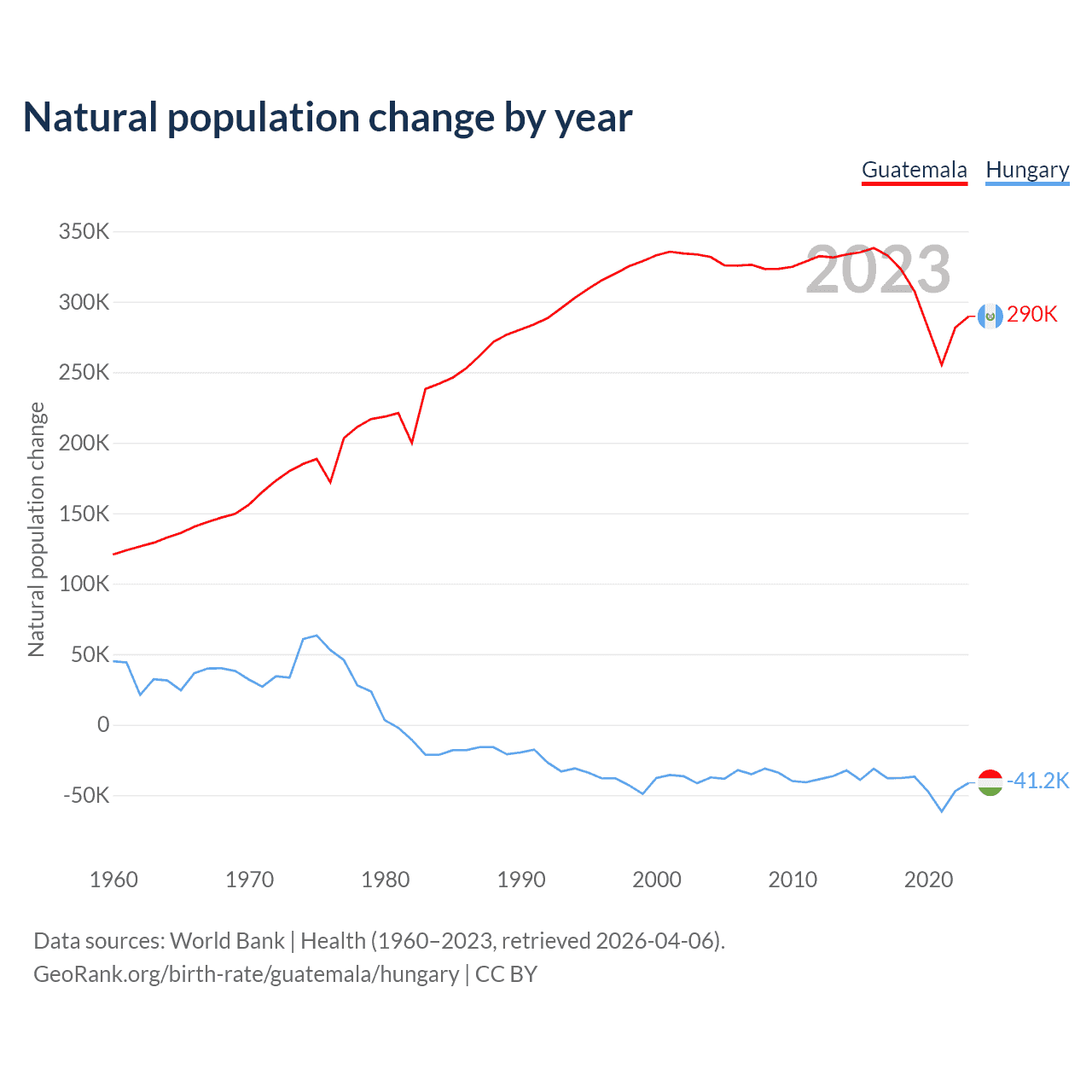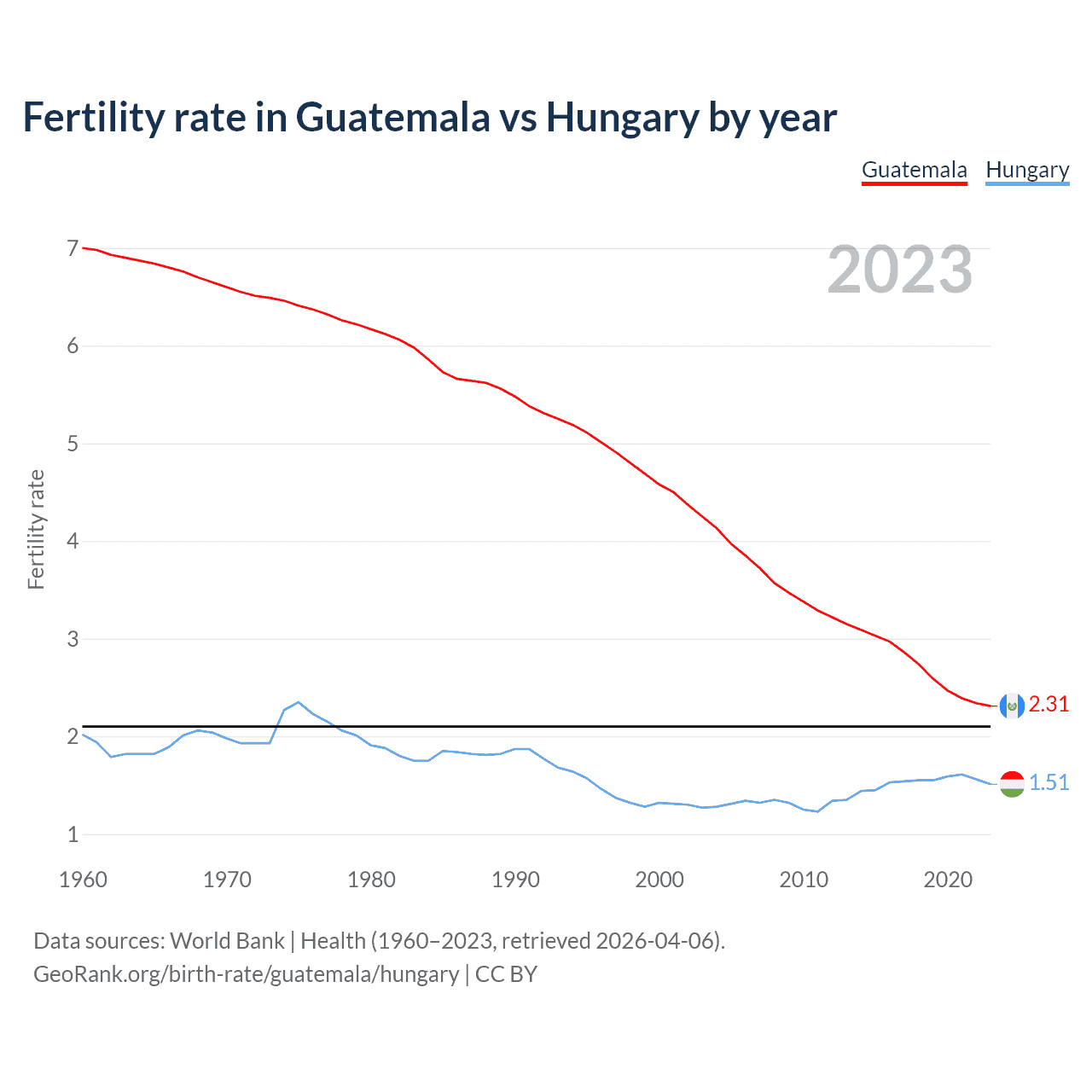 According to the latest available data on birth rates, the fertility rate in Guatemala was 2.31 children per woman in 2023, compared to 1.51 in Hungary in 2023. The replacement level is considered to be 2.1 children per woman.