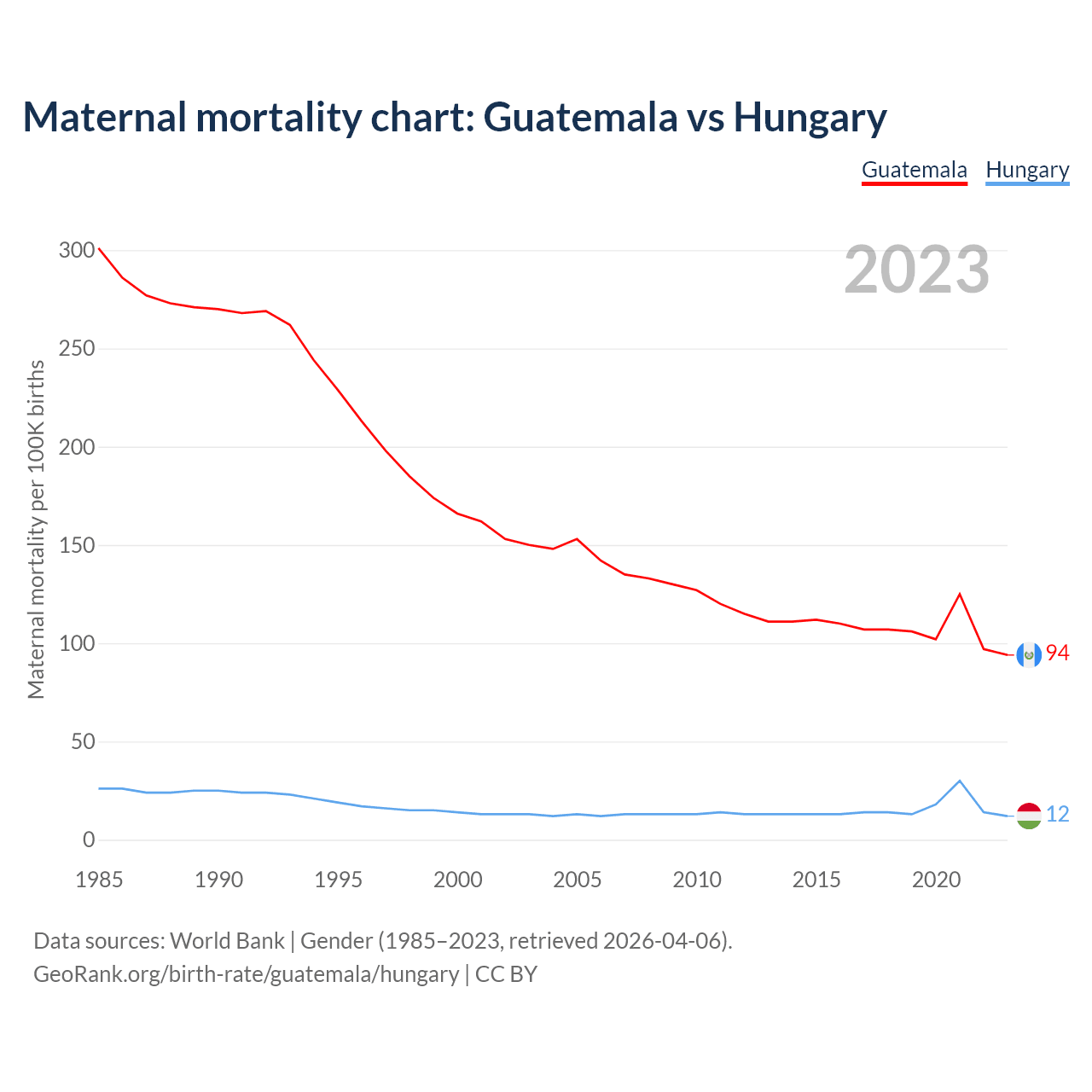 The maternal mortality rate, which is the probability of dying during childbirth or within 42 days of pregnancy termination, is 94 deaths per 100,000 live births in Guatemala, compared to 12 deaths in Hungary.