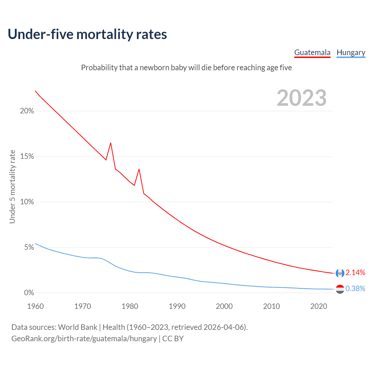 The chance that a newborn baby will die before reaching age five is 2.14% in Guatemala and 0.38% in Hungary. Above is a chart with historical data on under-five mortality rates.