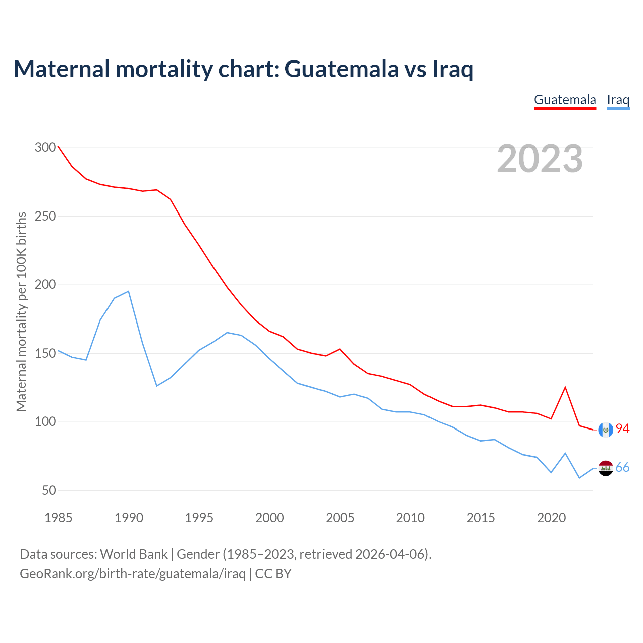 The maternal mortality rate, which is the probability of dying during childbirth or within 42 days of pregnancy termination, is 94 deaths per 100,000 live births in Guatemala, compared to 66 deaths in Iraq.