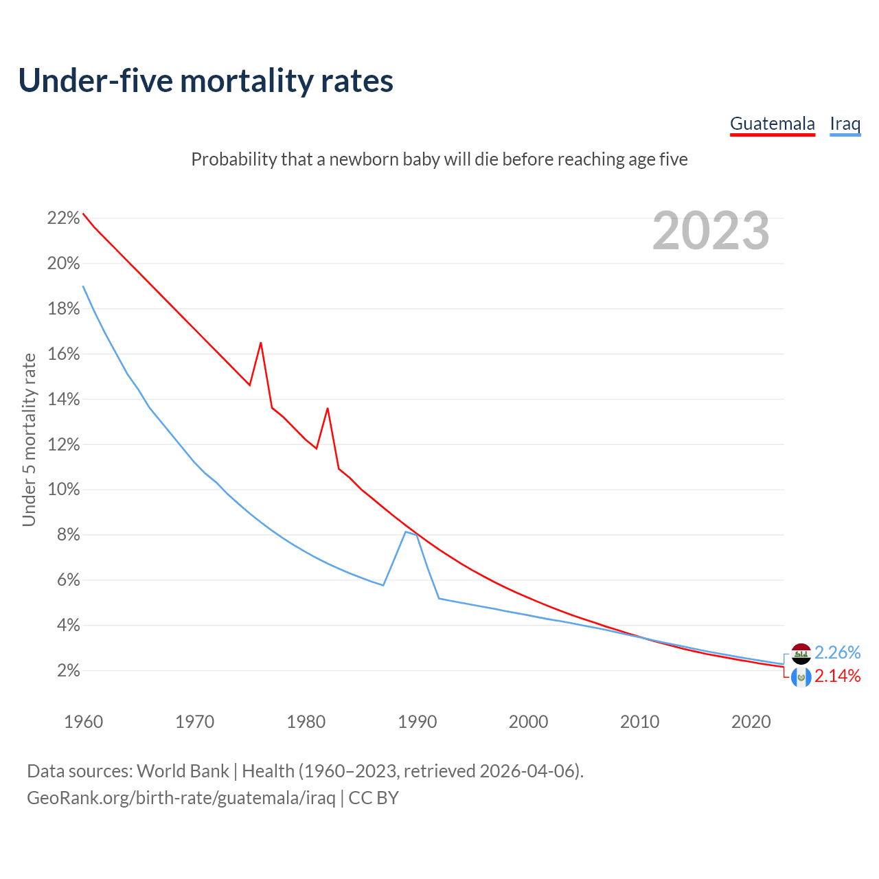 The chance that a newborn baby will die before reaching age five is 2.14% in Guatemala and 2.26% in Iraq. Above is a chart with historical data on under-five mortality rates.