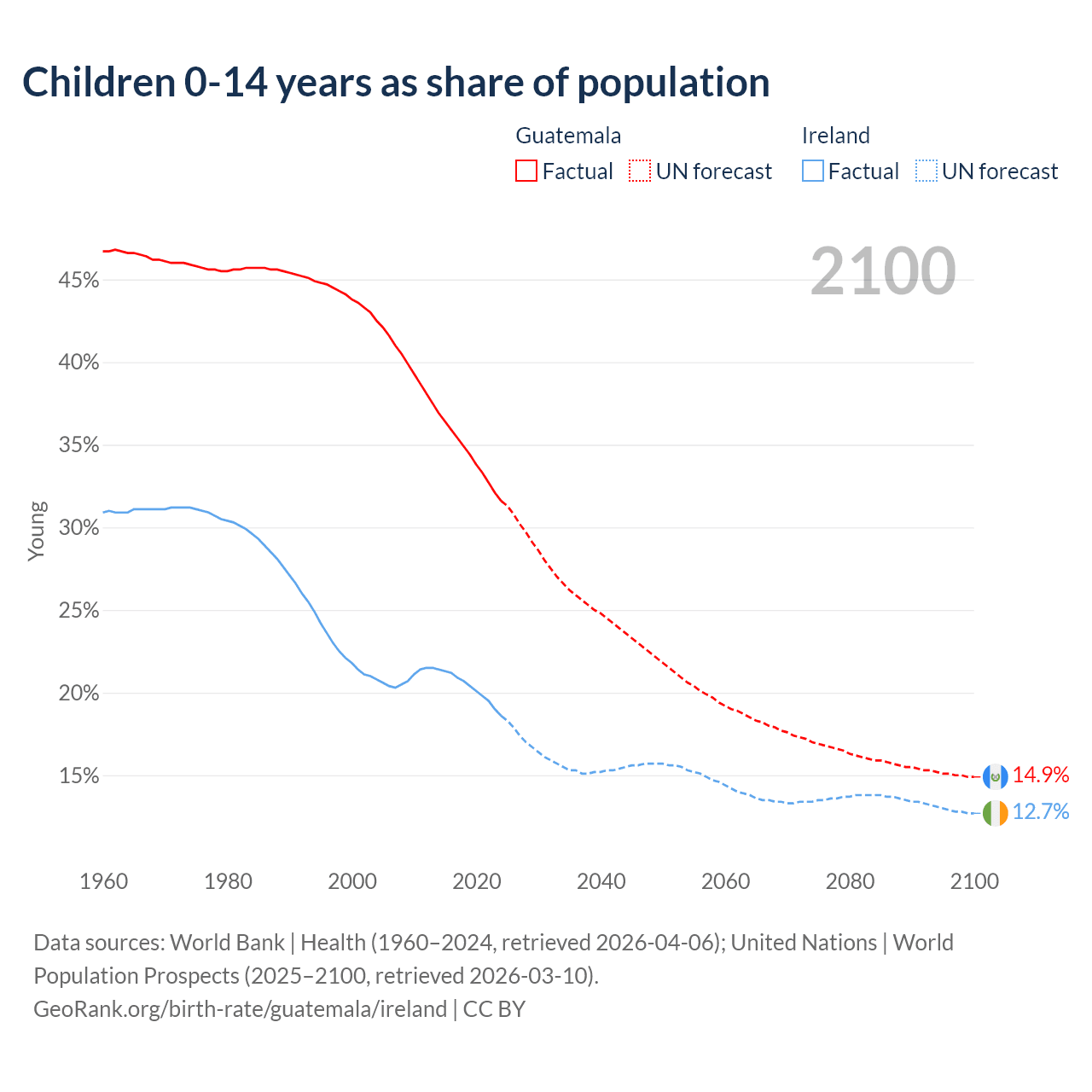 Guatemala has an annual birth rate of 20.8 births per 1,000 people, compared to 10.3 for Ireland. The average number of children a woman is expected to have during her lifetime — the fertility rate, is 2.31 in Guatemala and 1.5 in Ireland — 35.1% difference.