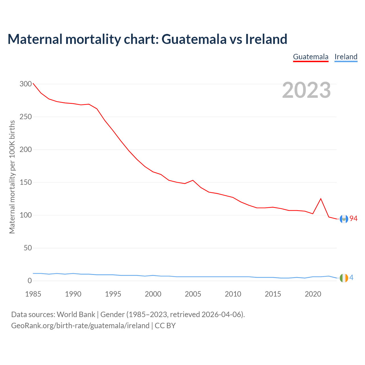 The maternal mortality rate, which is the probability of dying during childbirth or within 42 days of pregnancy termination, is 94 deaths per 100,000 live births in Guatemala, compared to 4 deaths in Ireland.