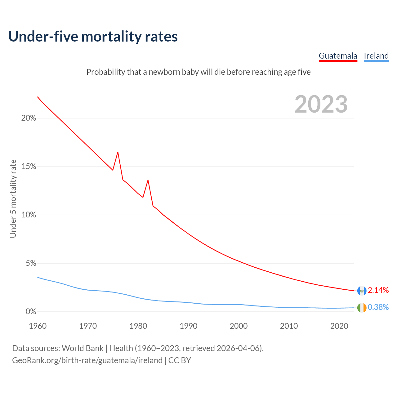 The chance that a newborn baby will die before reaching age five is 2.14% in Guatemala and 0.38% in Ireland. Above is a chart with historical data on under-five mortality rates.