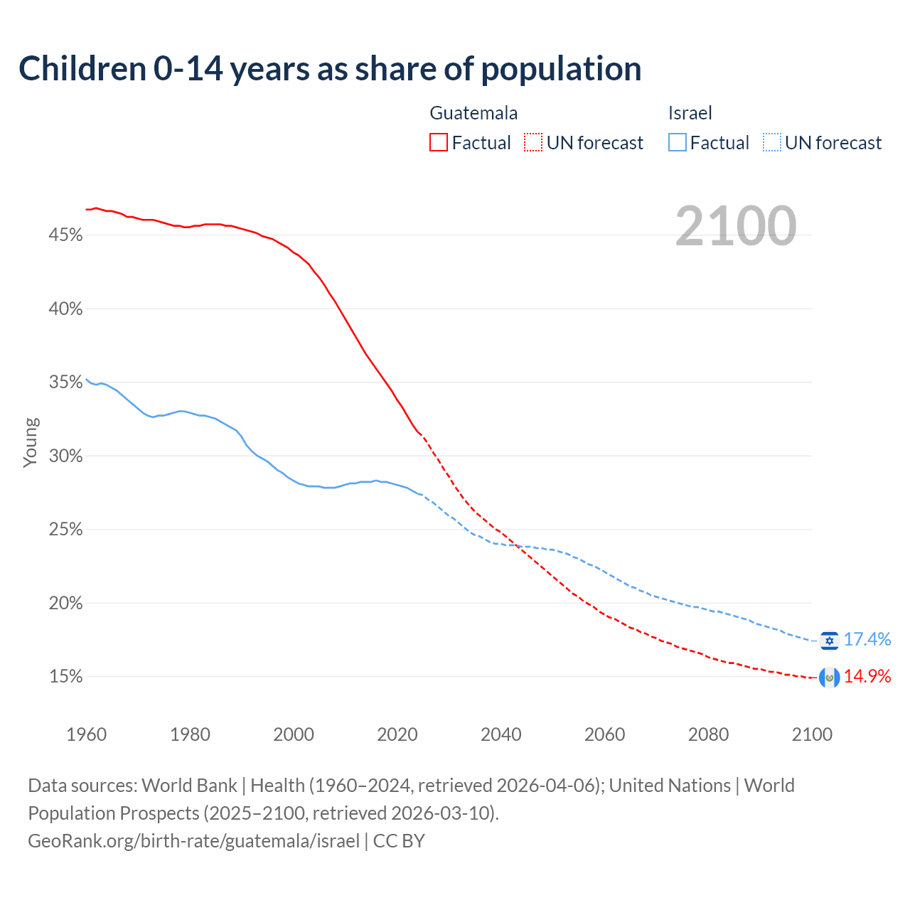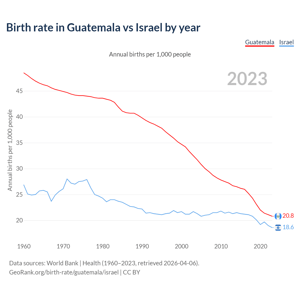 According to the latest available data on birth rates, the fertility rate in Guatemala was 2.31 children per woman in 2023, compared to 2.85 in Israel in 2023. The replacement level is considered to be 2.1 children per woman.