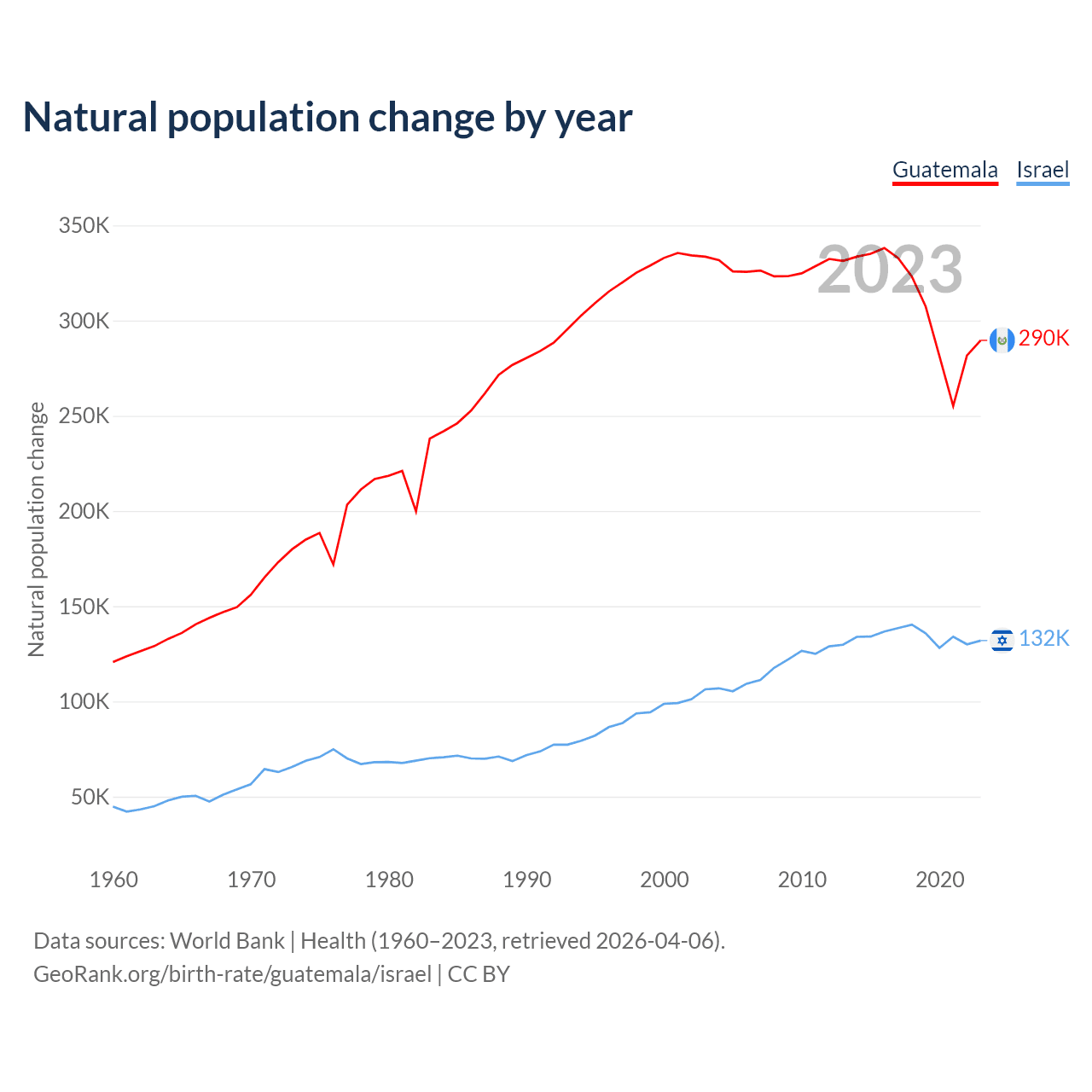 Guatemala has an annual birth rate of 20.8 births per 1,000 people, compared to 18.6 for Israel. The average number of children a woman is expected to have during her lifetime — the fertility rate, is 2.31 in Guatemala and 2.85 in Israel — 23.3% difference.