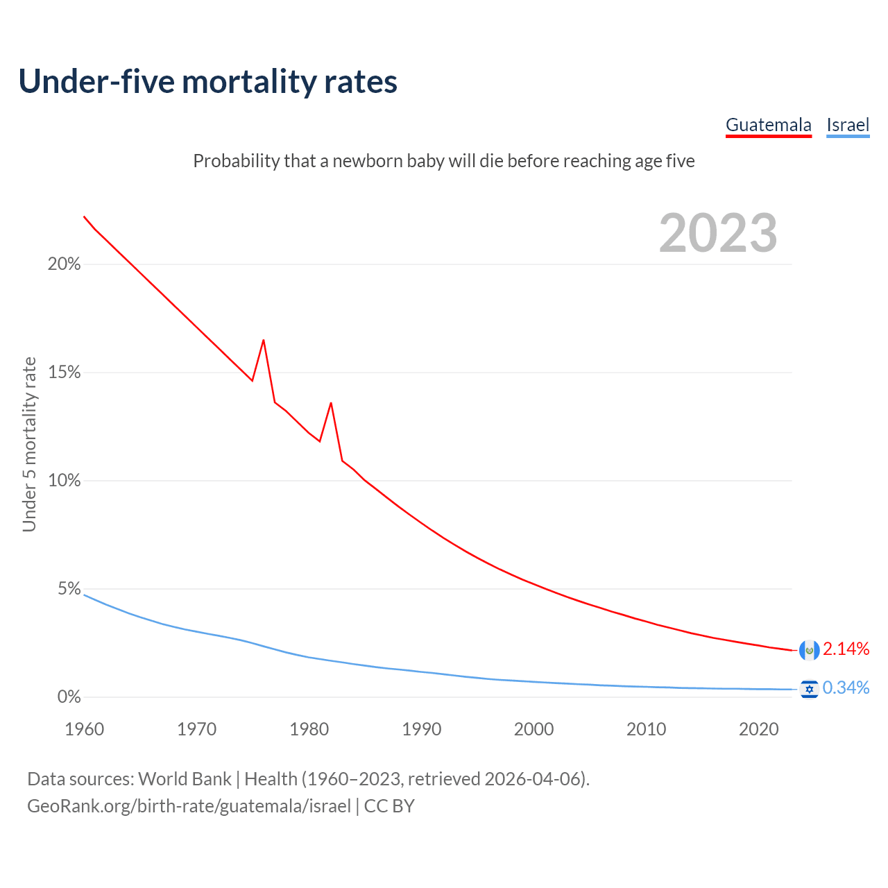 The chance that a newborn baby will die before reaching age five is 2.14% in Guatemala and 0.34% in Israel. Above is a chart with historical data on under-five mortality rates.