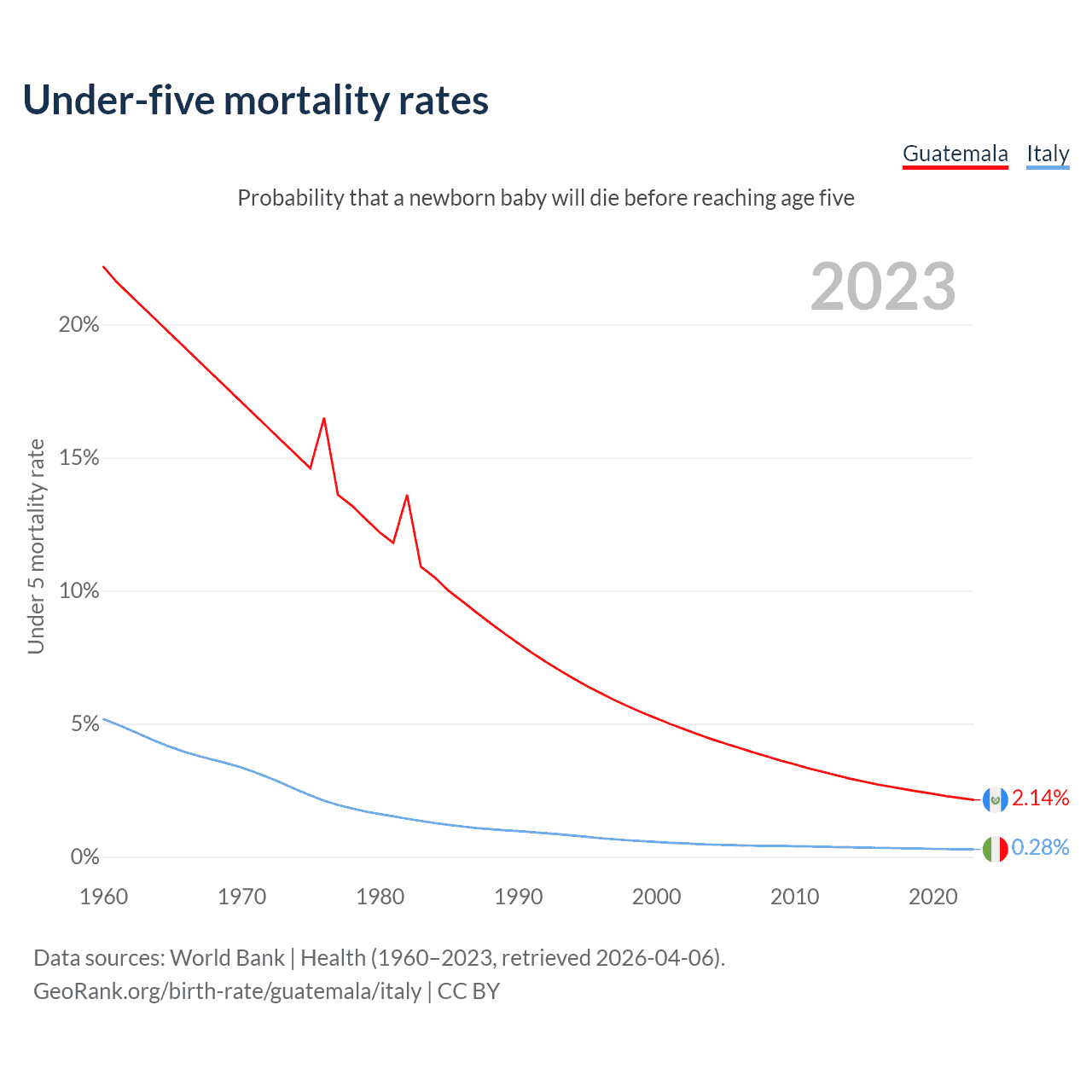 The chance that a newborn baby will die before reaching age five is 2.14% in Guatemala and 0.28% in Italy. Above is a chart with historical data on under-five mortality rates.