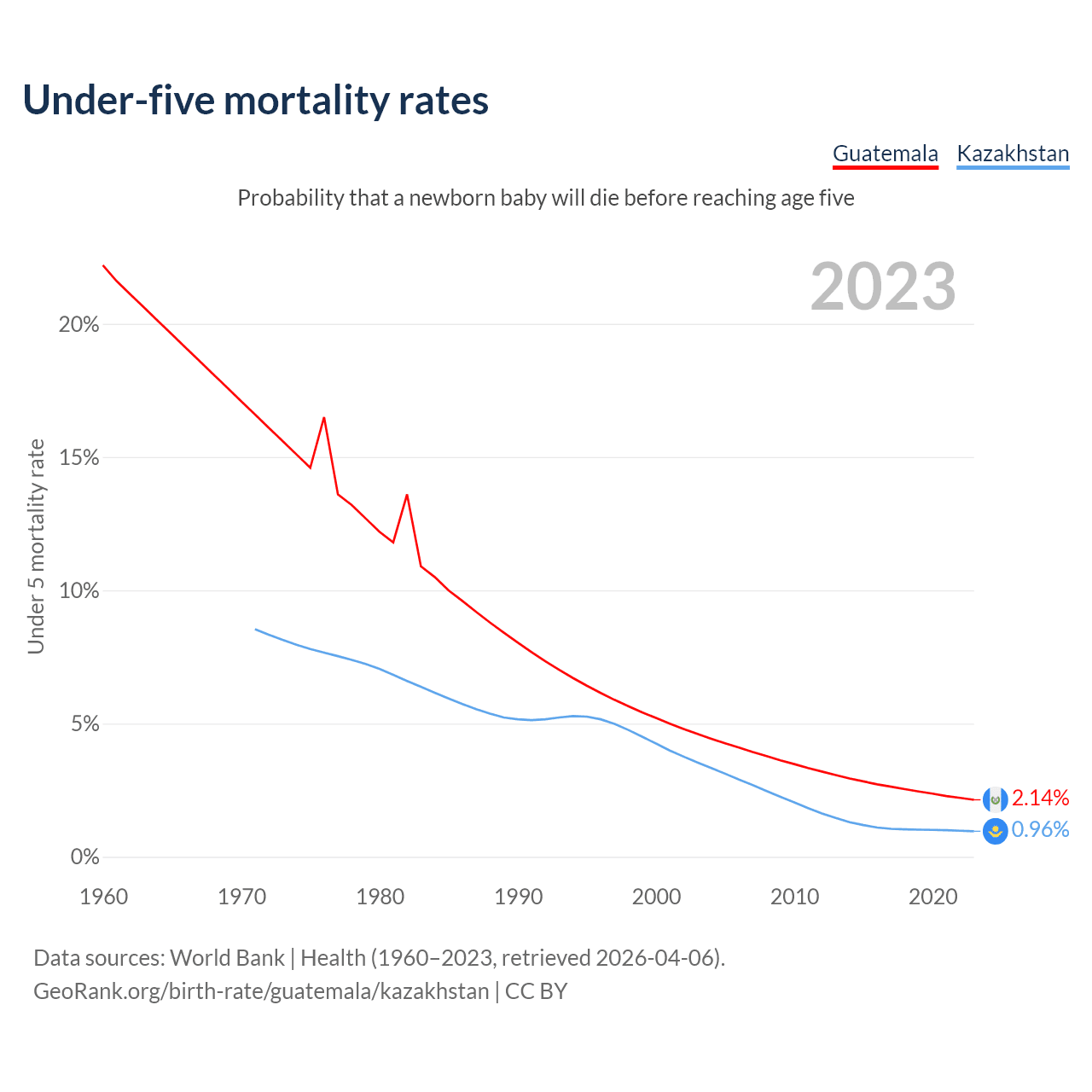The chance that a newborn baby will die before reaching age five is 2.14% in Guatemala and 0.96% in Kazakhstan. Above is a chart with historical data on under-five mortality rates.