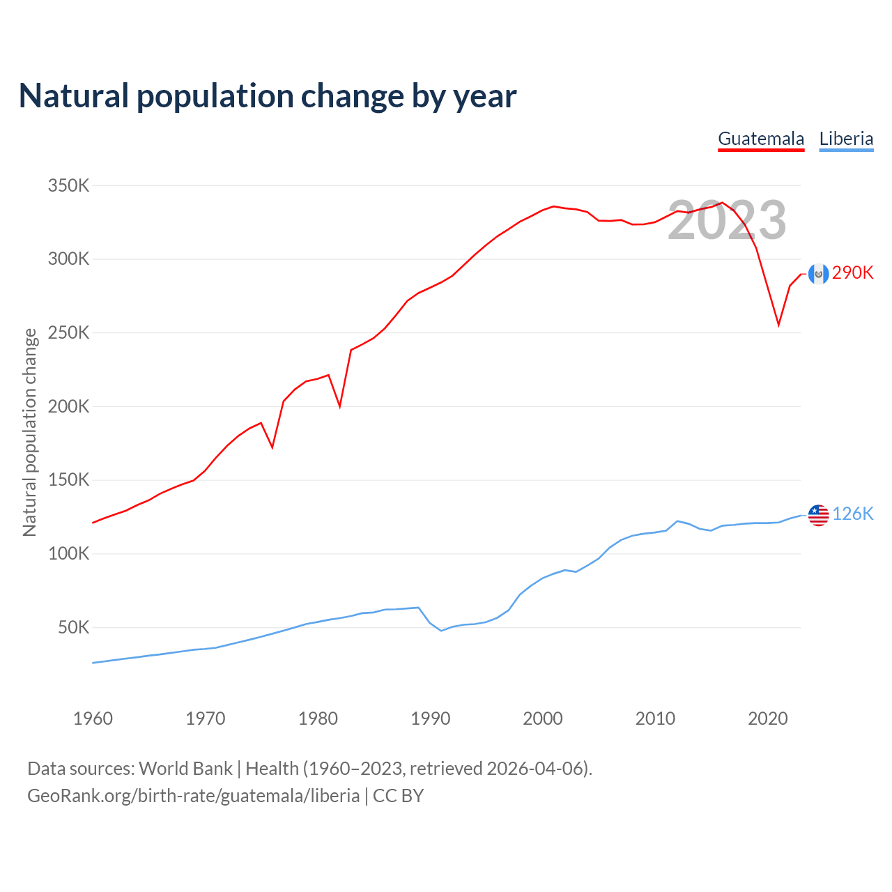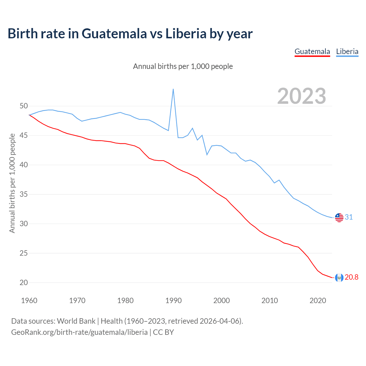 According to the latest available data on birth rates, the fertility rate in Guatemala was 2.31 children per woman in 2023, compared to 3.95 in Liberia in 2023. The replacement level is considered to be 2.1 children per woman.