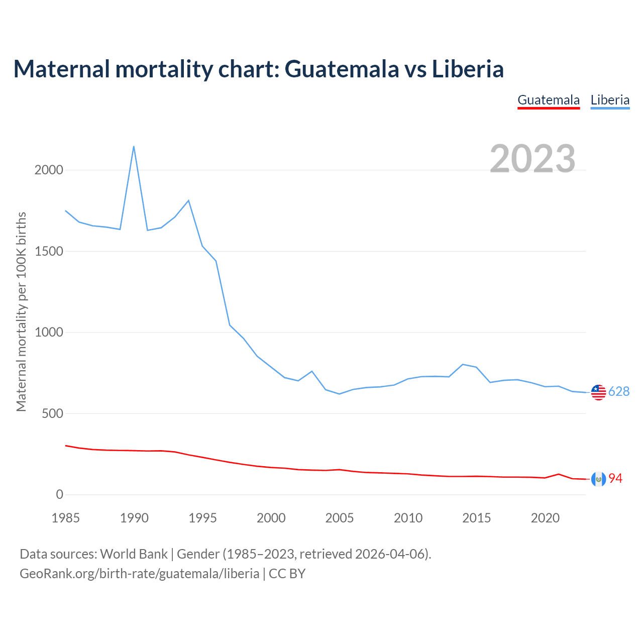 The maternal mortality rate, which is the probability of dying during childbirth or within 42 days of pregnancy termination, is 94 deaths per 100,000 live births in Guatemala, compared to 628 deaths in Liberia.
