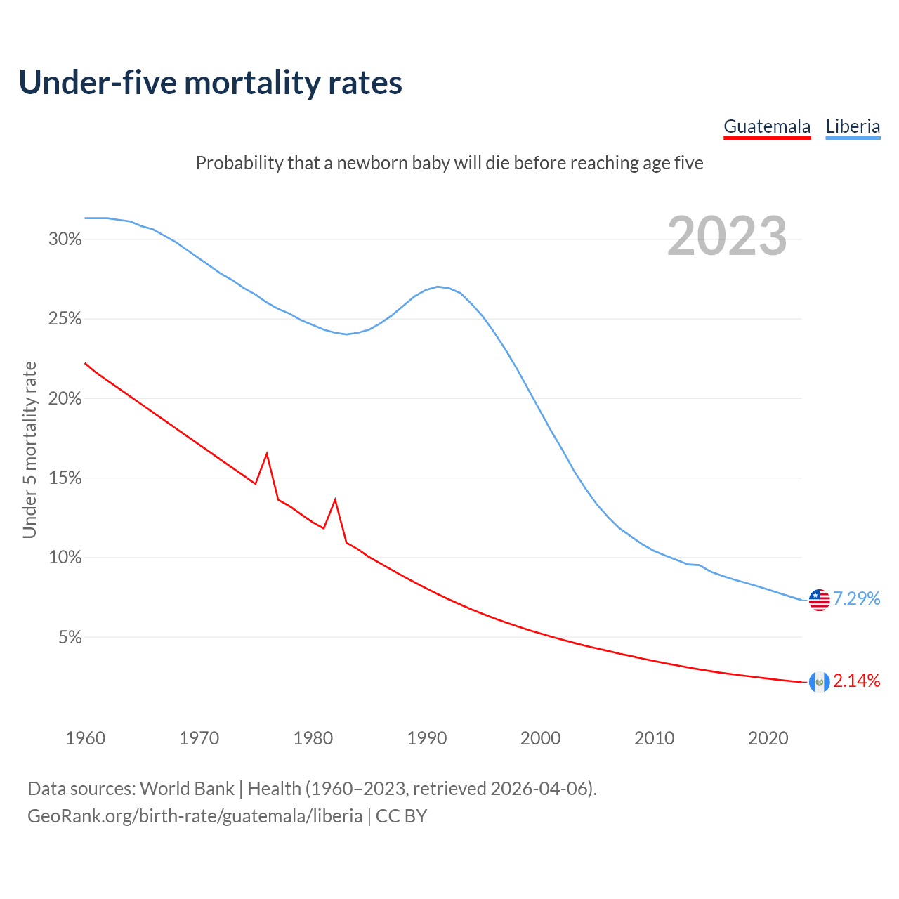 The chance that a newborn baby will die before reaching age five is 2.14% in Guatemala and 7.29% in Liberia. Above is a chart with historical data on under-five mortality rates.
