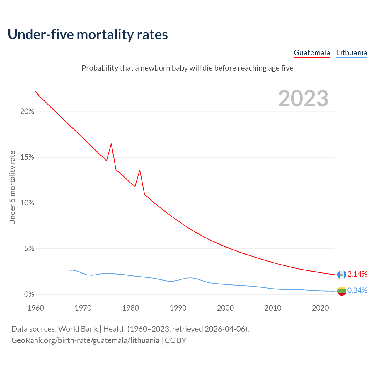 The chance that a newborn baby will die before reaching age five is 2.14% in Guatemala and 0.34% in Lithuania. Above is a chart with historical data on under-five mortality rates.