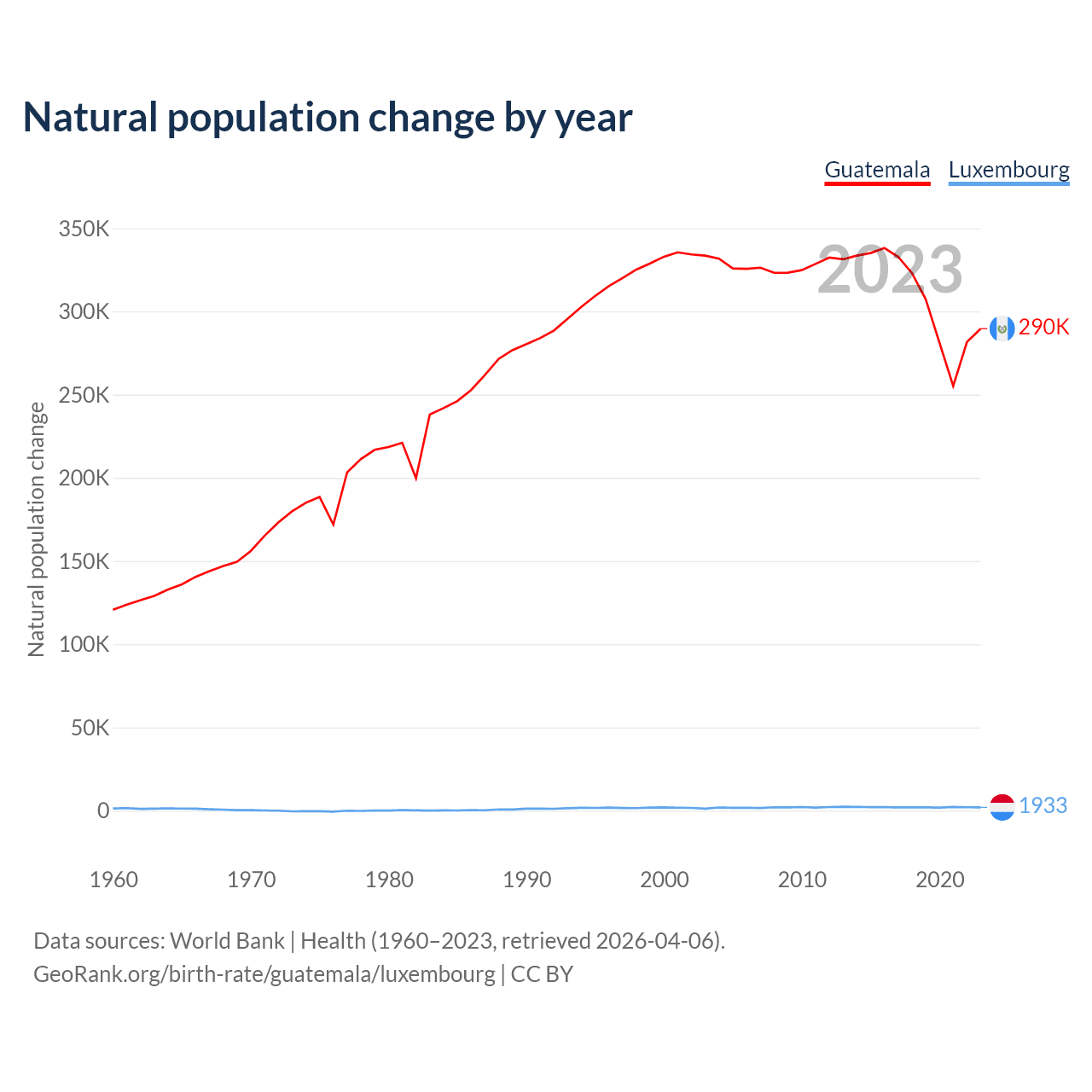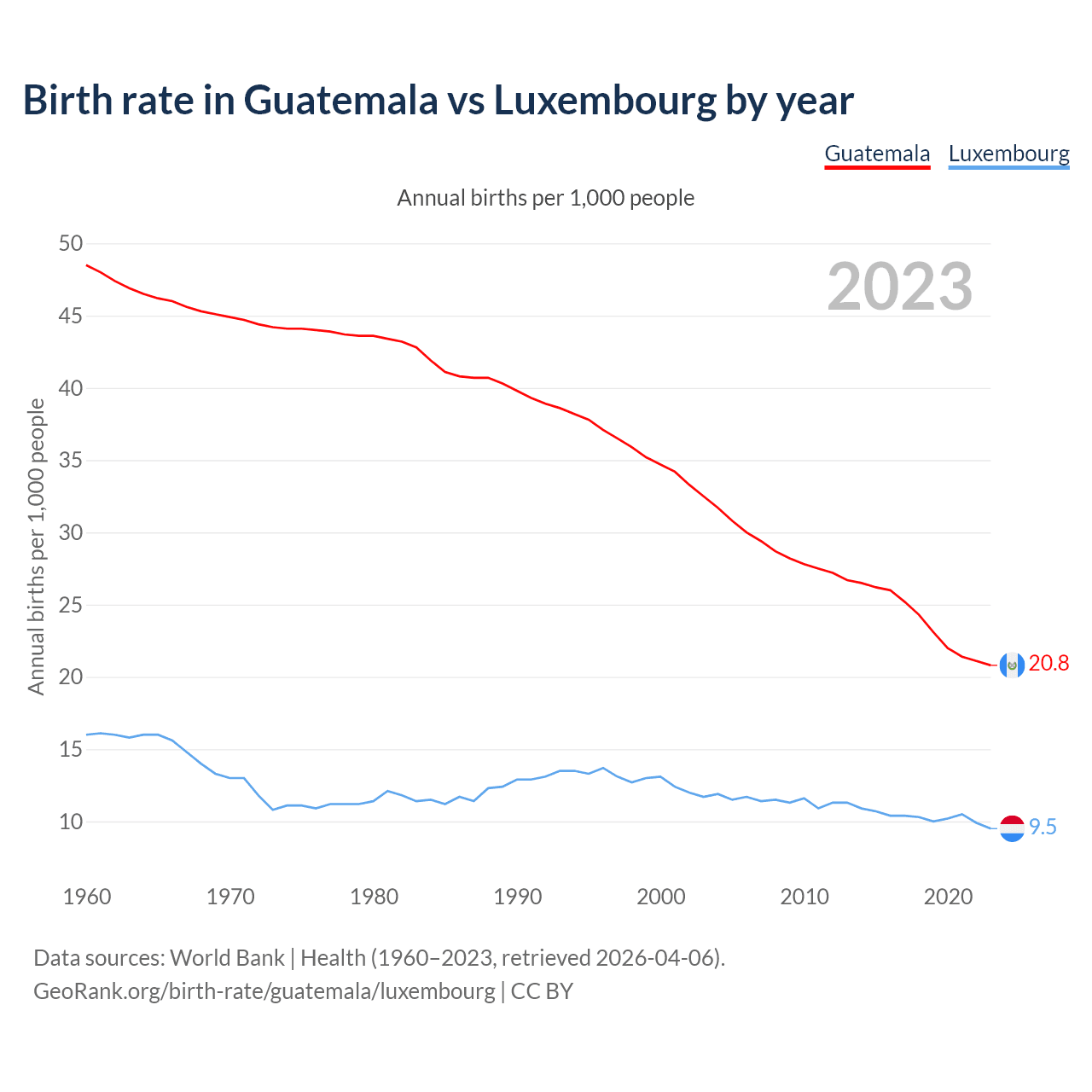 Guatemala has an annual birth rate of 20.8 births per 1,000 people, compared to 9.5 for Luxembourg. The average number of children a woman is expected to have during her lifetime — the fertility rate, is 2.31 in Guatemala and 1.25 in Luxembourg — 45.9% difference.