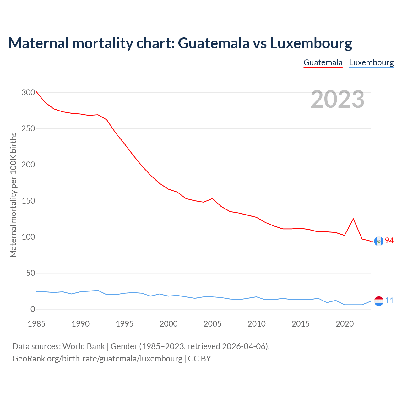 The maternal mortality rate, which is the probability of dying during childbirth or within 42 days of pregnancy termination, is 94 deaths per 100,000 live births in Guatemala, compared to 11 deaths in Luxembourg.