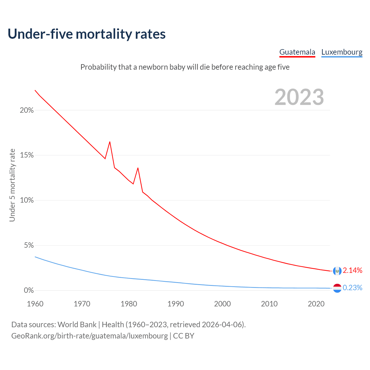 The chance that a newborn baby will die before reaching age five is 2.14% in Guatemala and 0.23% in Luxembourg. Above is a chart with historical data on under-five mortality rates.
