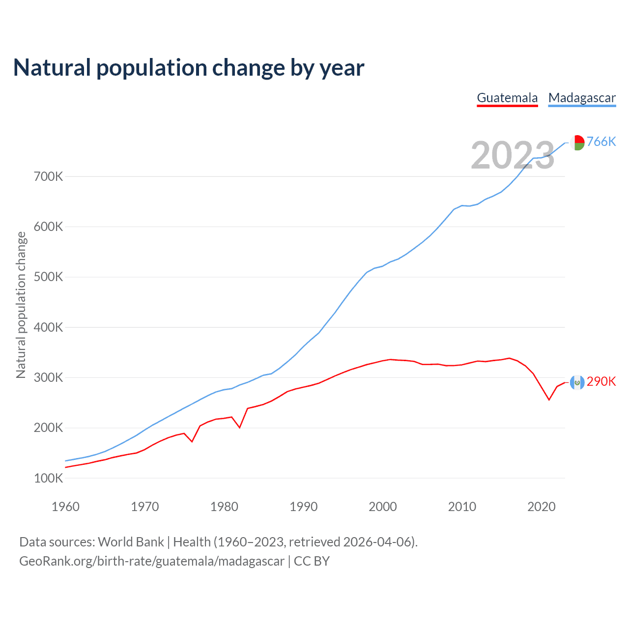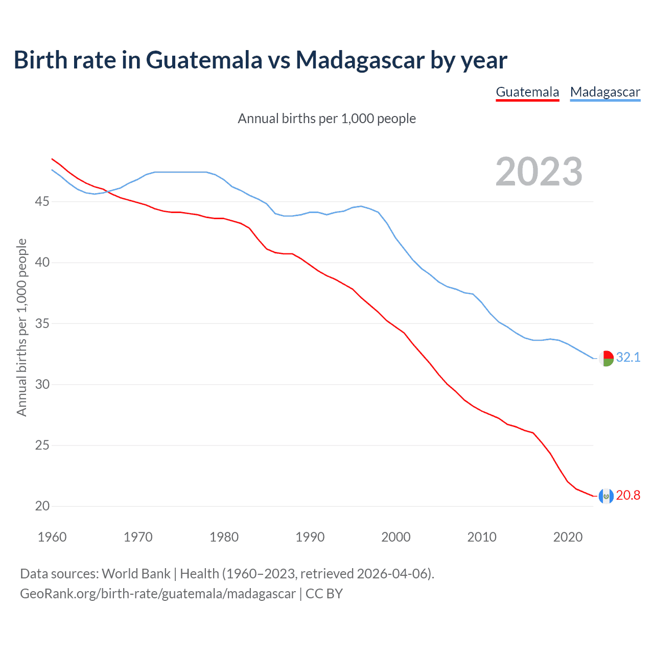 Guatemala has an annual birth rate of 20.8 births per 1,000 people, compared to 32.1 for Madagascar. The average number of children a woman is expected to have during her lifetime — the fertility rate, is 2.31 in Guatemala and 3.97 in Madagascar — 71.9% difference.