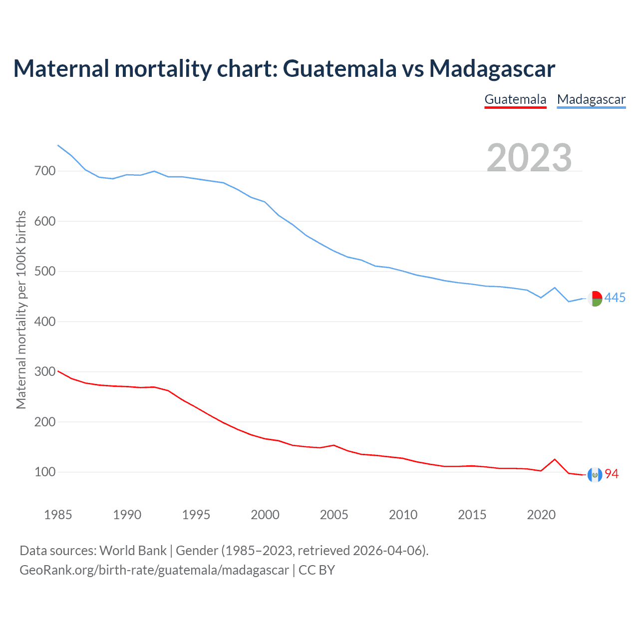 The maternal mortality rate, which is the probability of dying during childbirth or within 42 days of pregnancy termination, is 94 deaths per 100,000 live births in Guatemala, compared to 445 deaths in Madagascar.