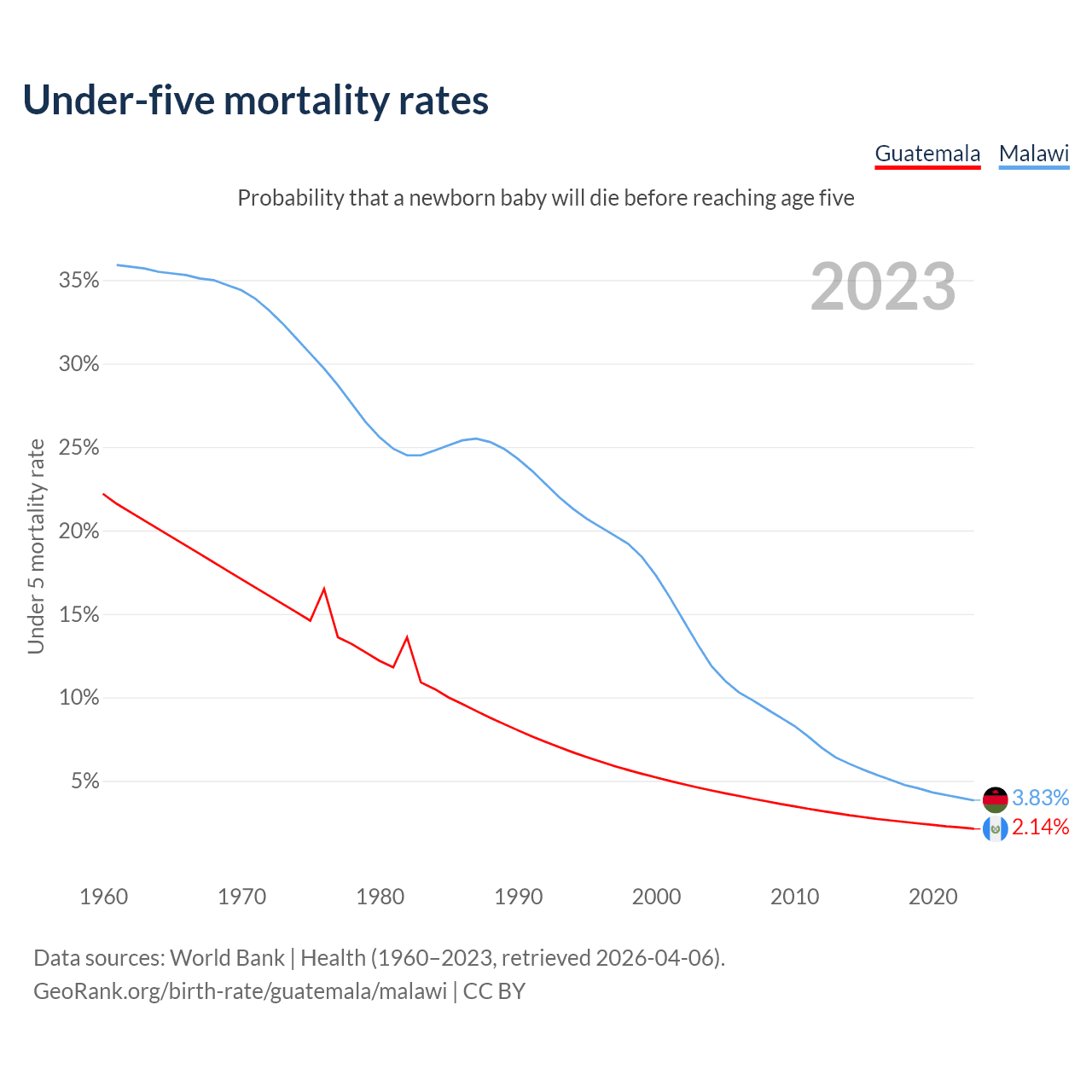 The chance that a newborn baby will die before reaching age five is 2.14% in Guatemala and 3.83% in Malawi. Above is a chart with historical data on under-five mortality rates.