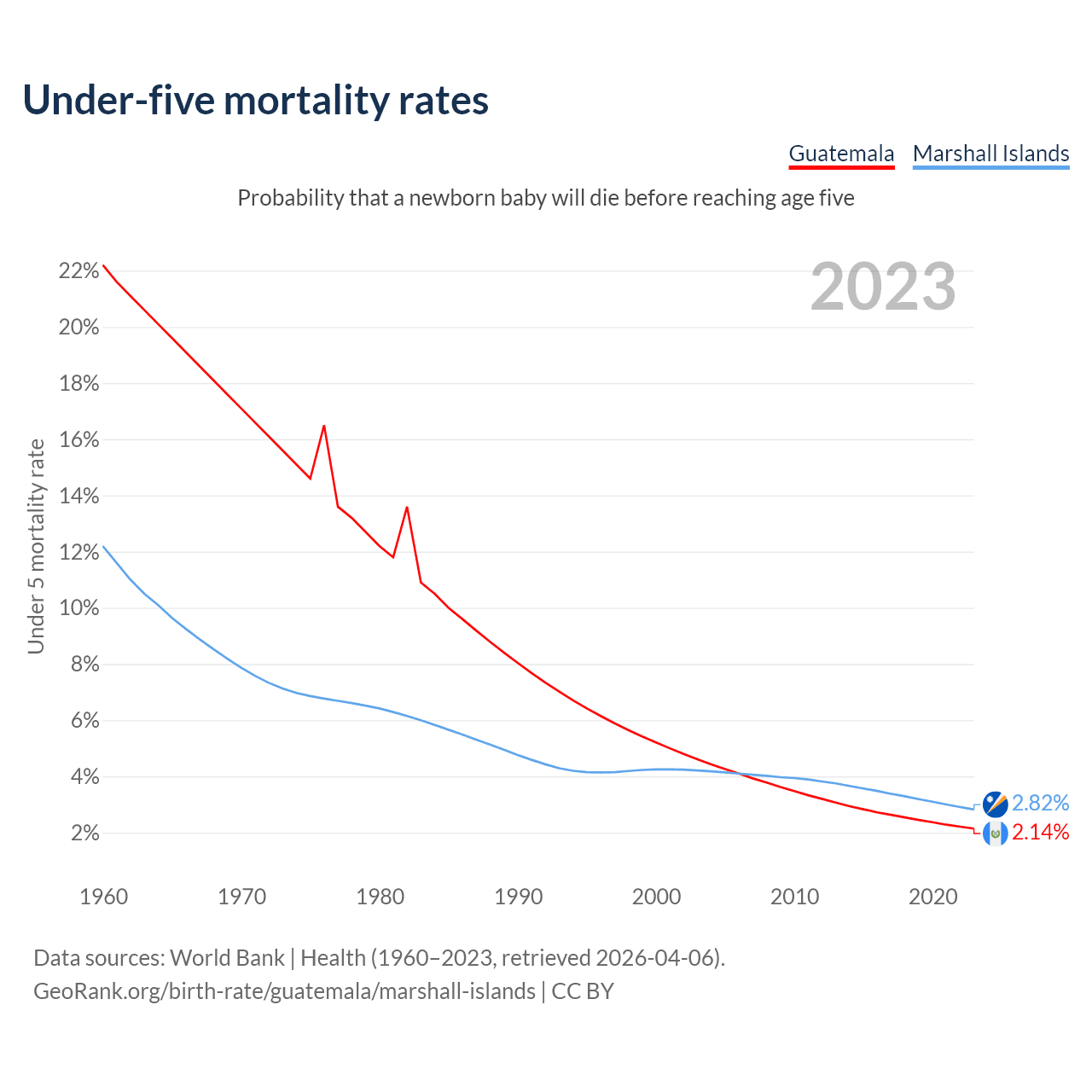 The chance that a newborn baby will die before reaching age five is 2.14% in Guatemala and 2.82% in the Marshall Islands. Above is a chart with historical data on under-five mortality rates.