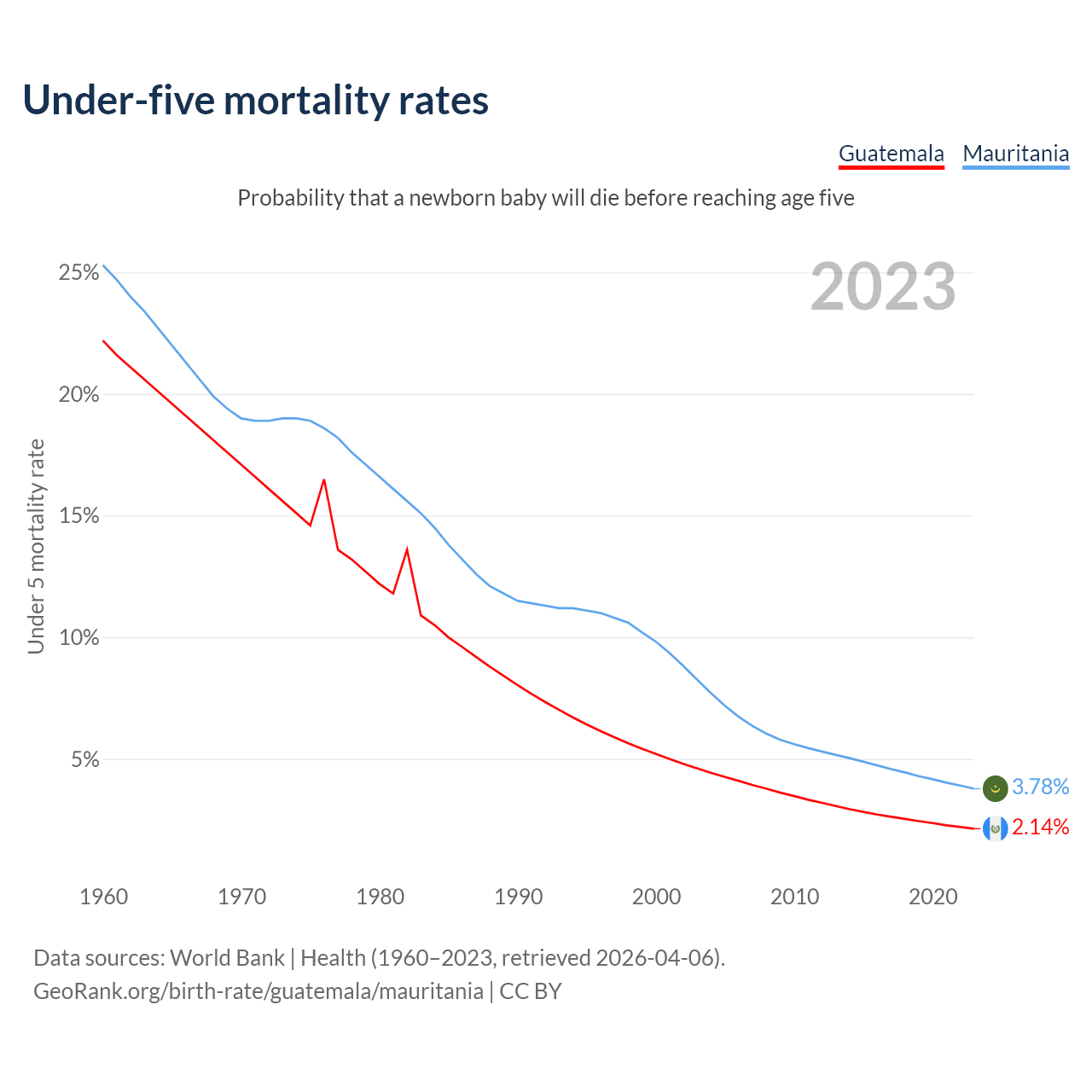 The chance that a newborn baby will die before reaching age five is 2.14% in Guatemala and 3.78% in Mauritania. Above is a chart with historical data on under-five mortality rates.