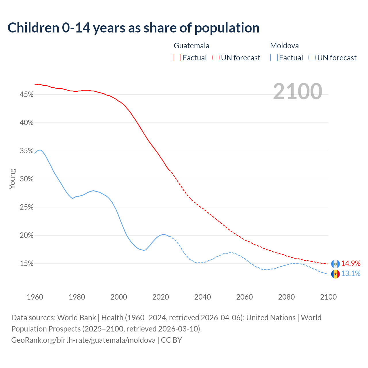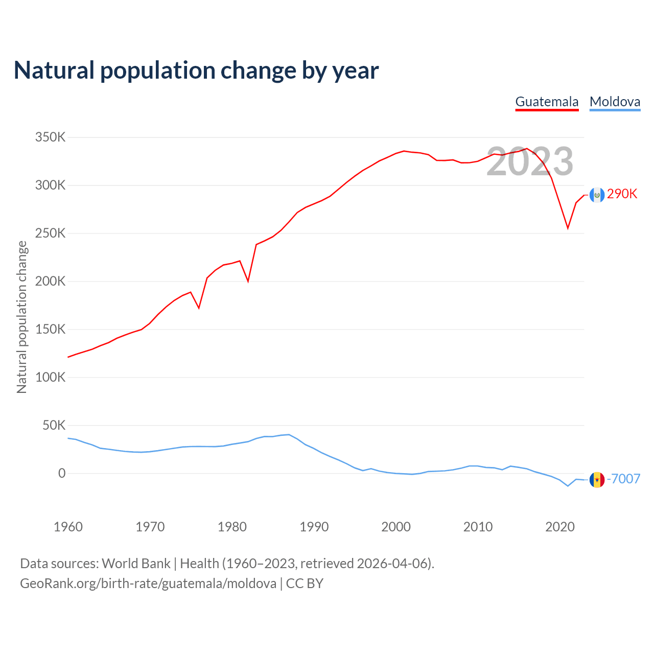According to the latest available data on birth rates, the fertility rate in Guatemala was 2.31 children per woman in 2023, compared to 1.73 in Moldova in 2023. The replacement level is considered to be 2.1 children per woman.