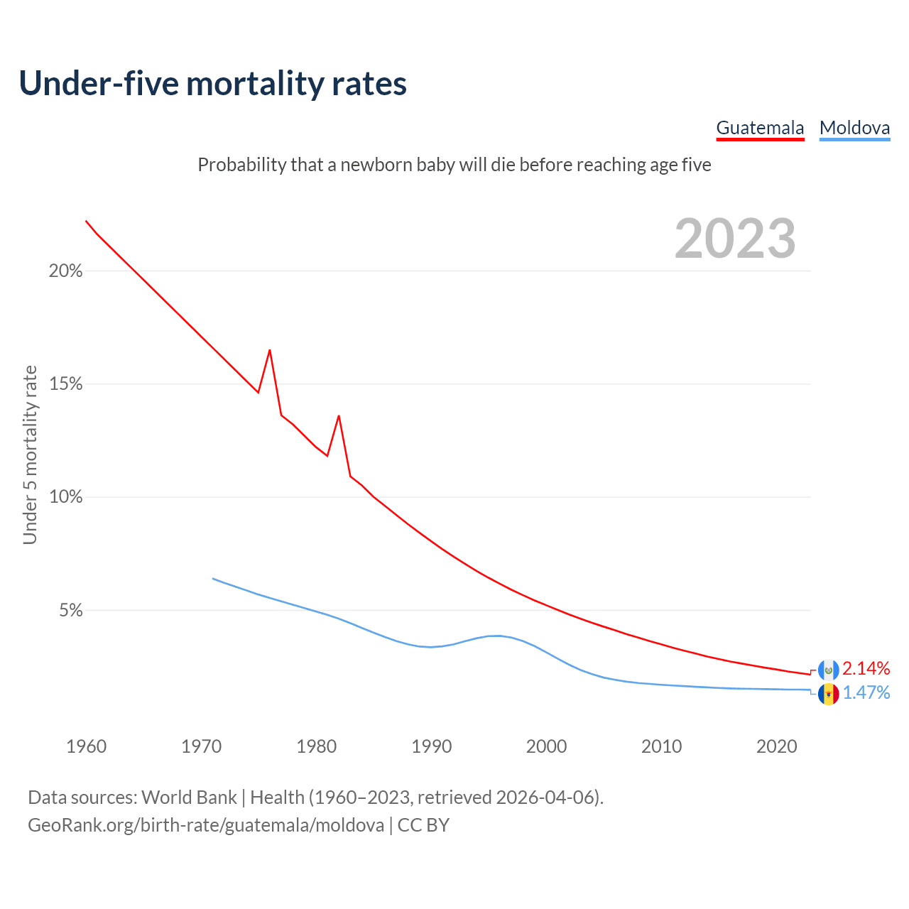 The chance that a newborn baby will die before reaching age five is 2.14% in Guatemala and 1.47% in Moldova. Above is a chart with historical data on under-five mortality rates.