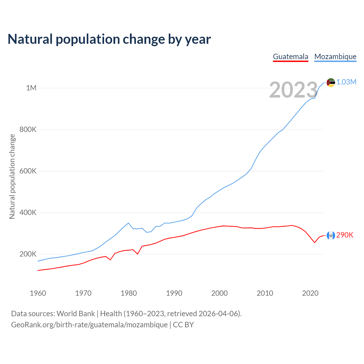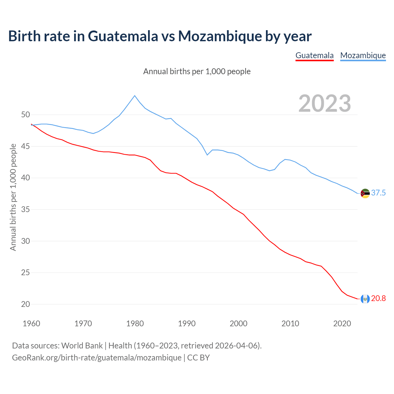 Guatemala has an annual birth rate of 20.8 births per 1,000 people, compared to 37.5 for Mozambique. The average number of children a woman is expected to have during her lifetime — the fertility rate, is 2.31 in Guatemala and 4.76 in Mozambique — 106.1% difference.