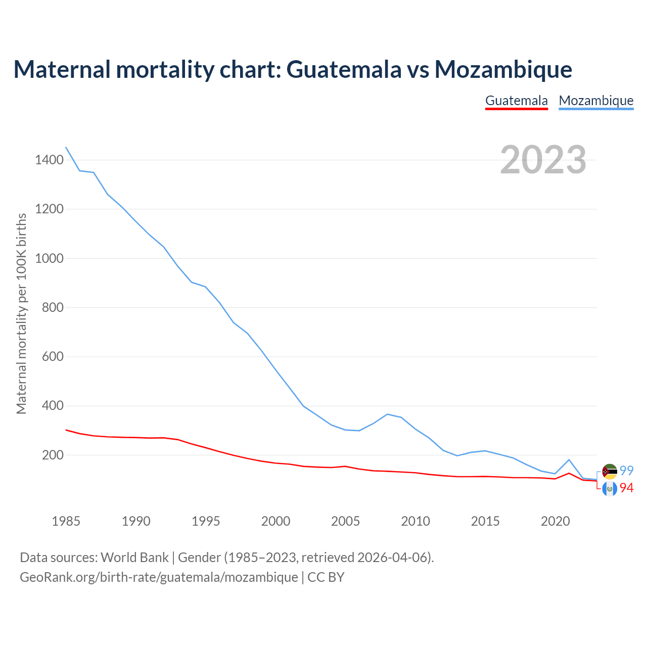 The maternal mortality rate, which is the probability of dying during childbirth or within 42 days of pregnancy termination, is 94 deaths per 100,000 live births in Guatemala, compared to 99 deaths in Mozambique.