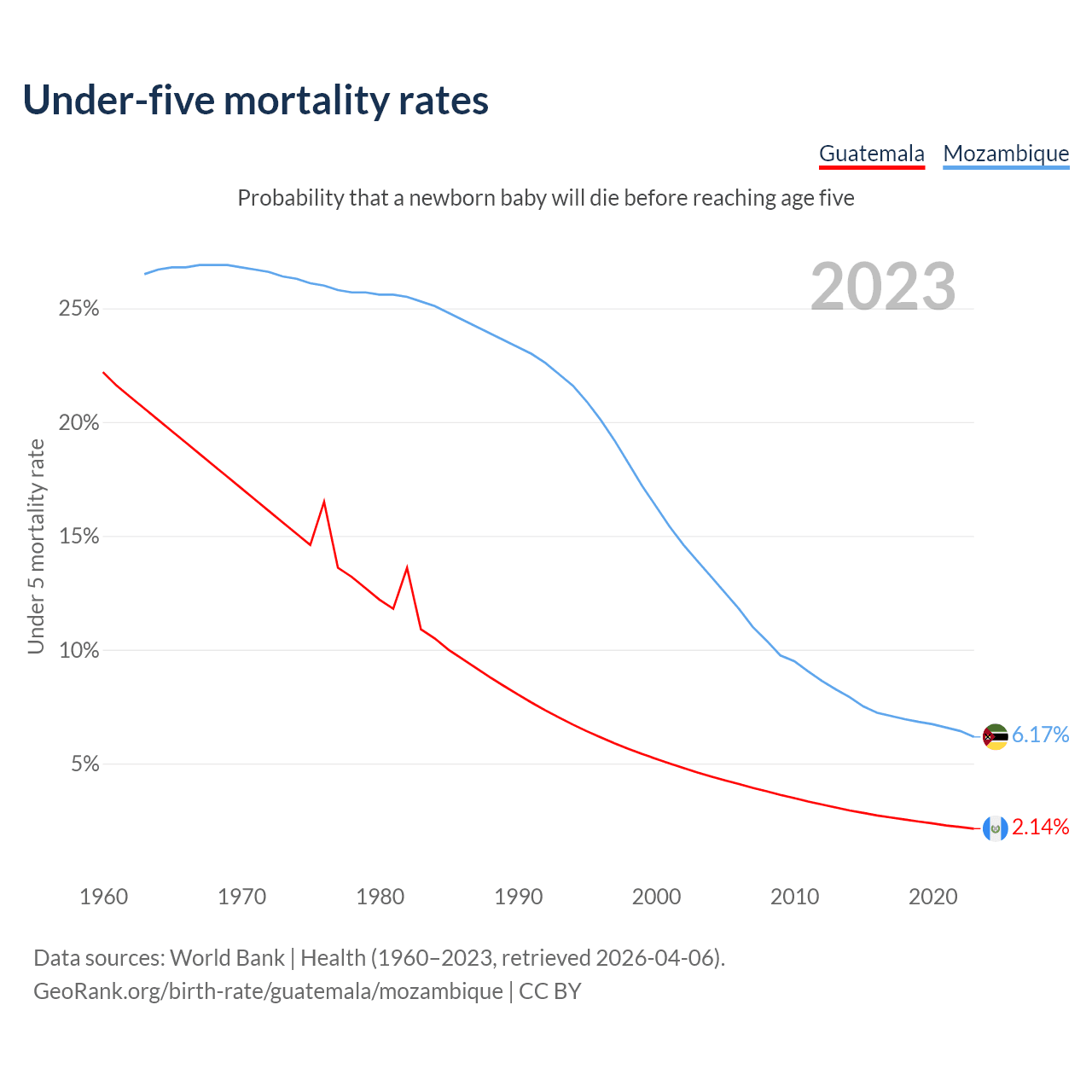 The chance that a newborn baby will die before reaching age five is 2.14% in Guatemala and 6.17% in Mozambique. Above is a chart with historical data on under-five mortality rates.