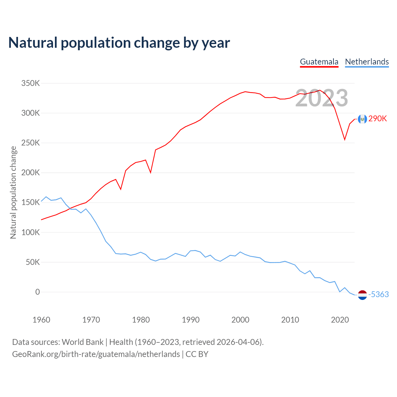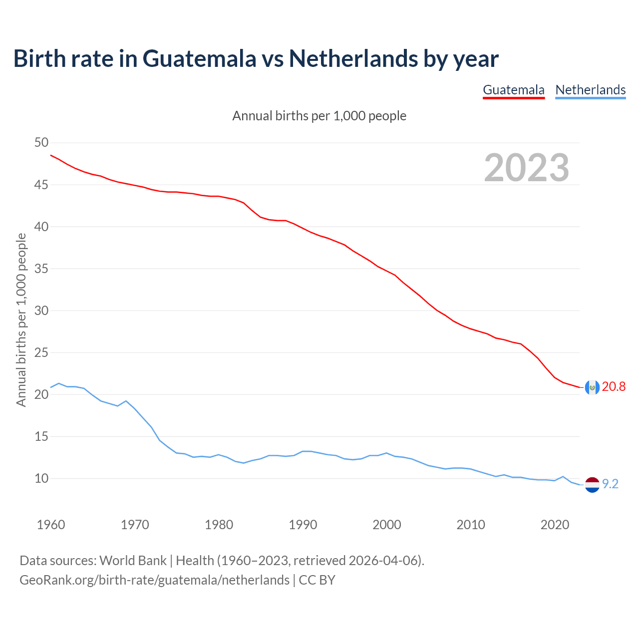 Guatemala has an annual birth rate of 20.8 births per 1,000 people, compared to 9.2 for the Netherlands. The average number of children a woman is expected to have during her lifetime — the fertility rate, is 2.31 in Guatemala and 1.43 in the Netherlands — 38.1% difference.