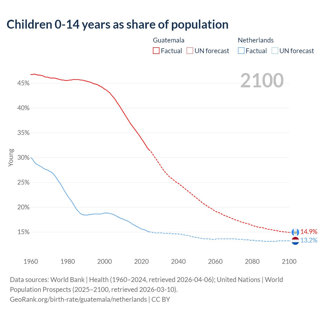 According to the latest available data on birth rates, the fertility rate in Guatemala was 2.31 children per woman in 2023, compared to 1.43 in the Netherlands in 2023. The replacement level is considered to be 2.1 children per woman.