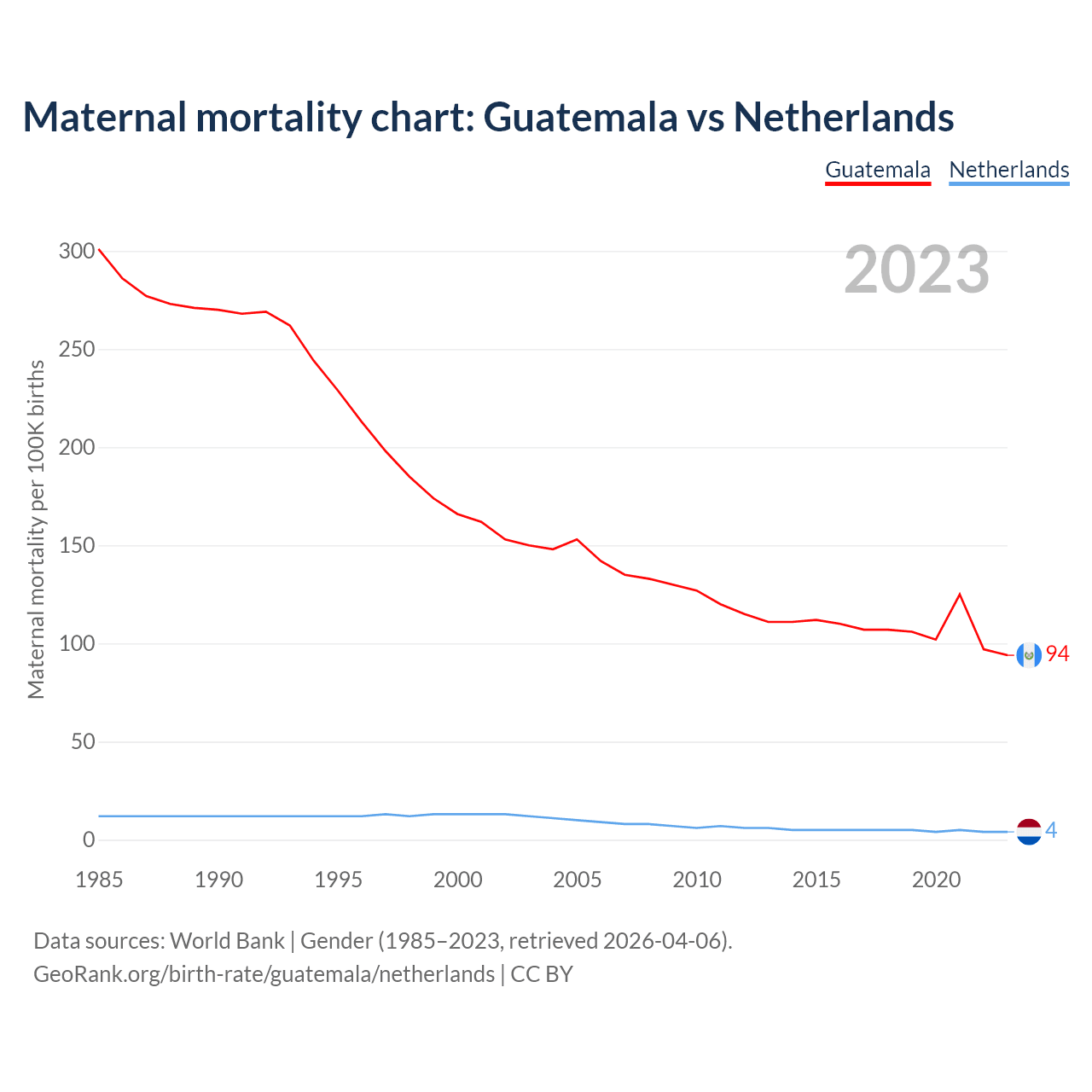 The maternal mortality rate, which is the probability of dying during childbirth or within 42 days of pregnancy termination, is 94 deaths per 100,000 live births in Guatemala, compared to 4 deaths in the Netherlands.