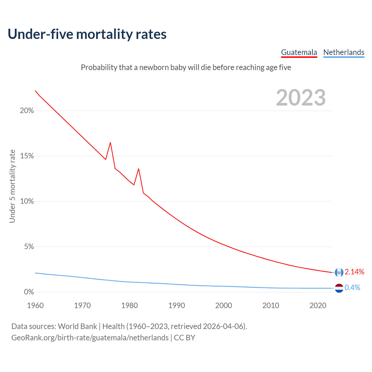The chance that a newborn baby will die before reaching age five is 2.14% in Guatemala and 0.4% in the Netherlands. Above is a chart with historical data on under-five mortality rates.