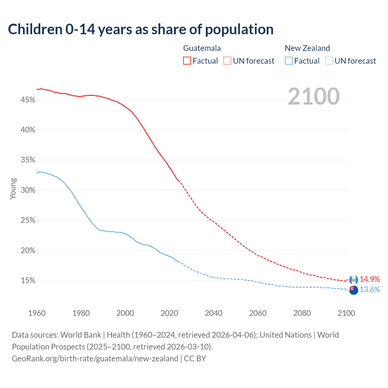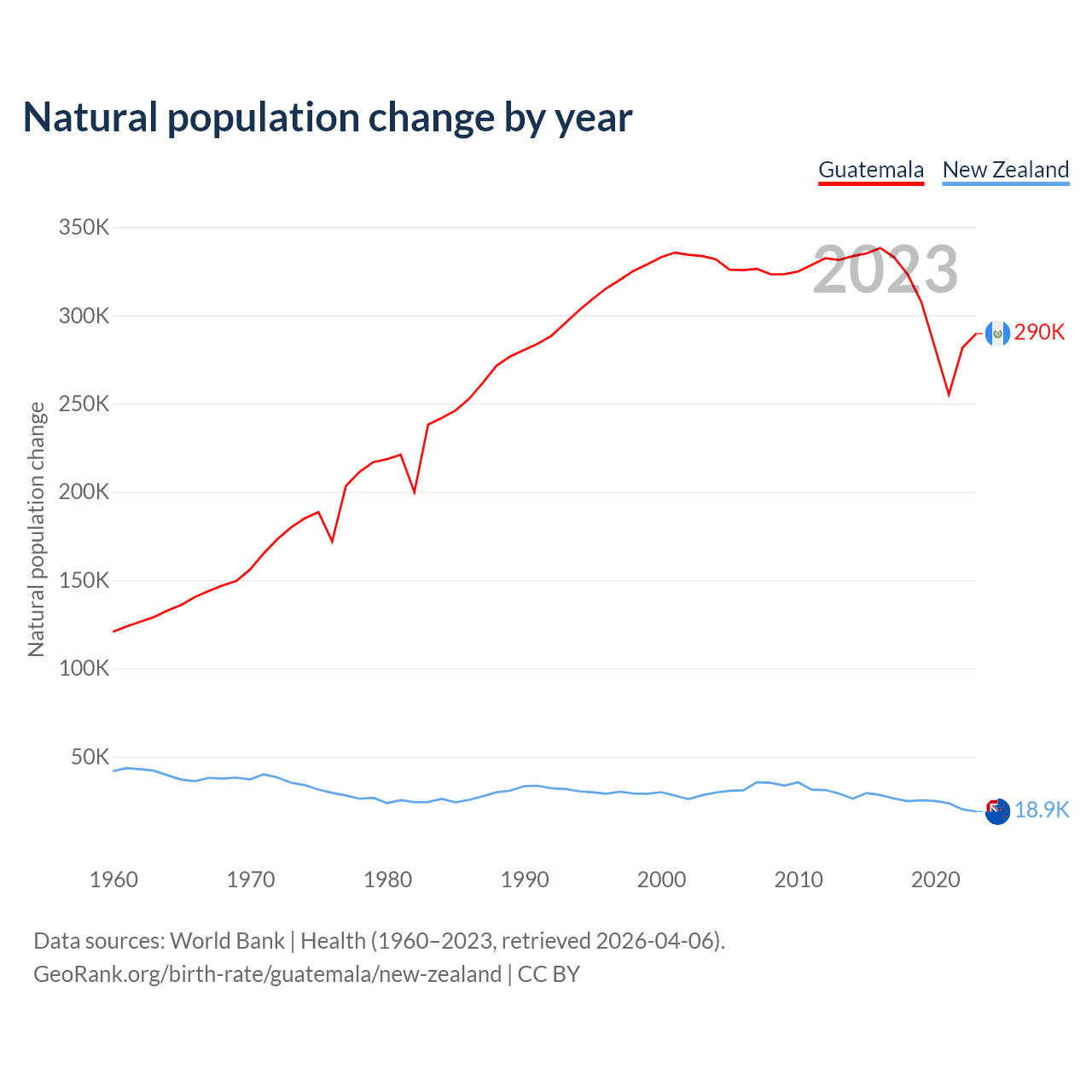 According to the latest available data on birth rates, the fertility rate in Guatemala was 2.31 children per woman in 2023, compared to 1.56 in New Zealand in 2023. The replacement level is considered to be 2.1 children per woman.