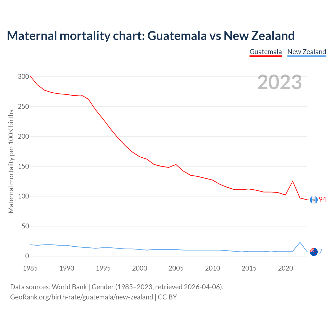 The maternal mortality rate, which is the probability of dying during childbirth or within 42 days of pregnancy termination, is 94 deaths per 100,000 live births in Guatemala, compared to 7 deaths in New Zealand.