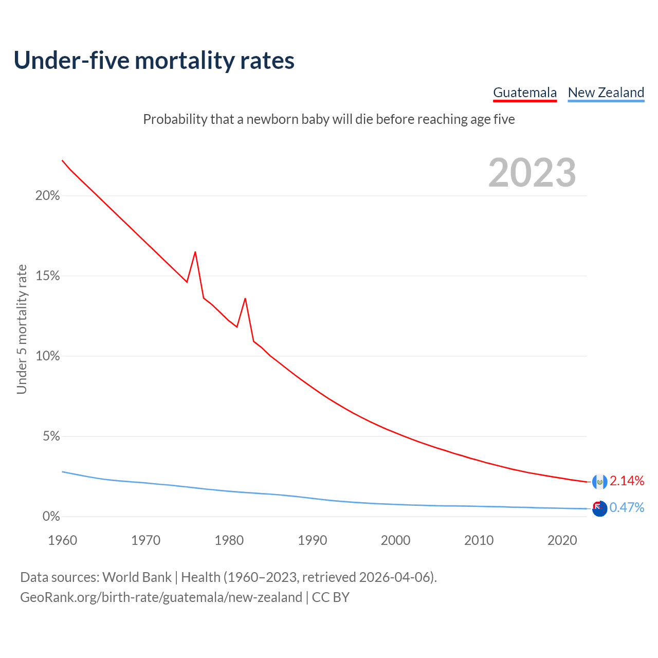 The chance that a newborn baby will die before reaching age five is 2.14% in Guatemala and 0.47% in New Zealand. Above is a chart with historical data on under-five mortality rates.