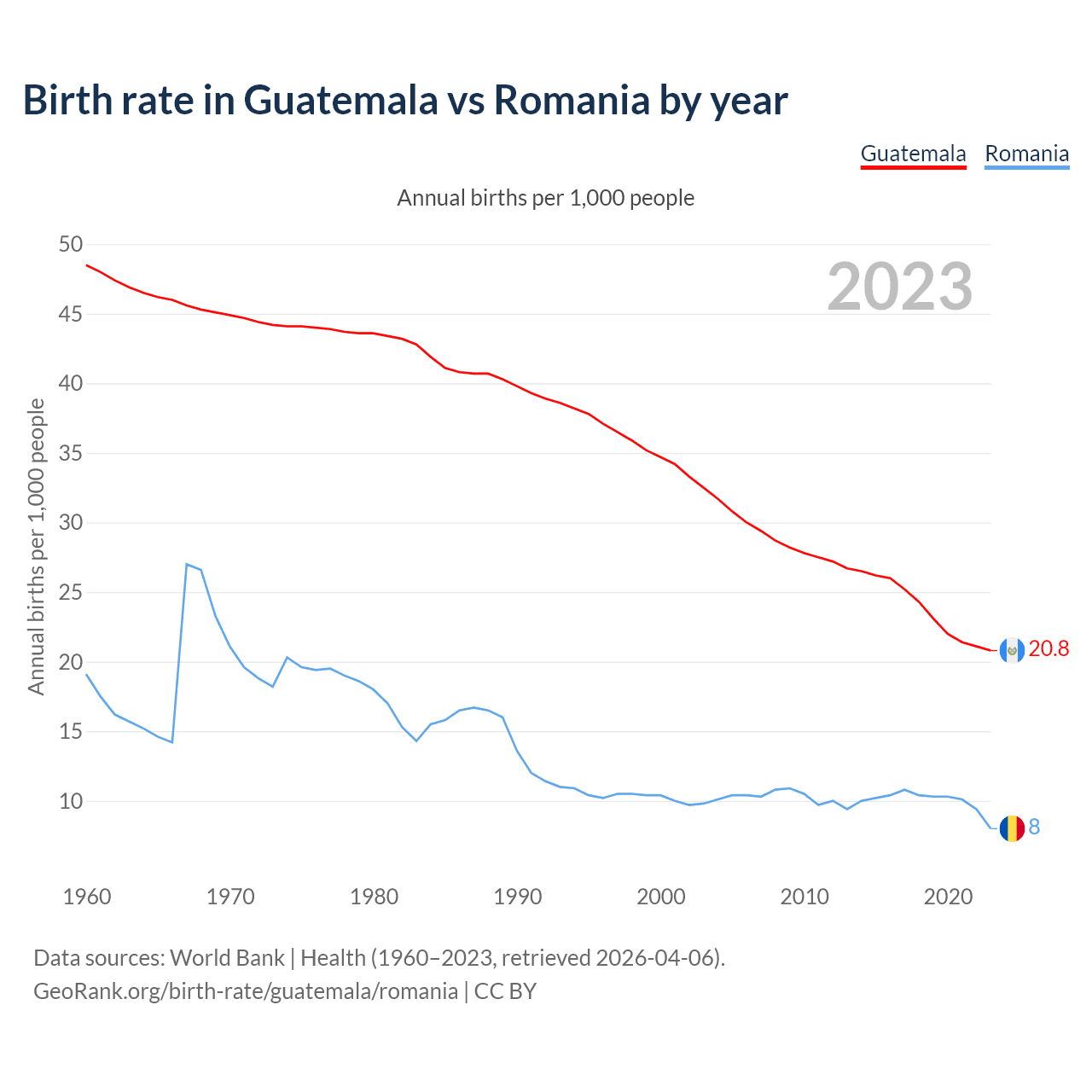 Guatemala has an annual birth rate of 20.8 births per 1,000 people, compared to 8 for Romania. The average number of children a woman is expected to have during her lifetime — the fertility rate, is 2.31 in Guatemala and 1.71 in Romania — 26% difference.