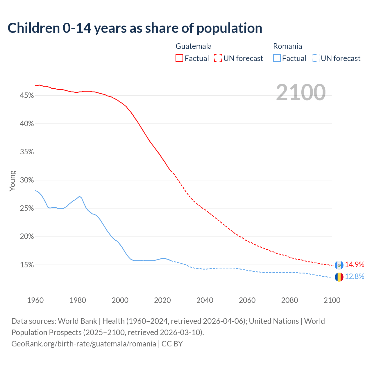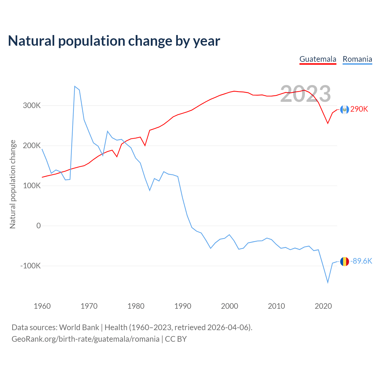 According to the latest available data on birth rates, the fertility rate in Guatemala was 2.31 children per woman in 2023, compared to 1.71 in Romania in 2023. The replacement level is considered to be 2.1 children per woman.