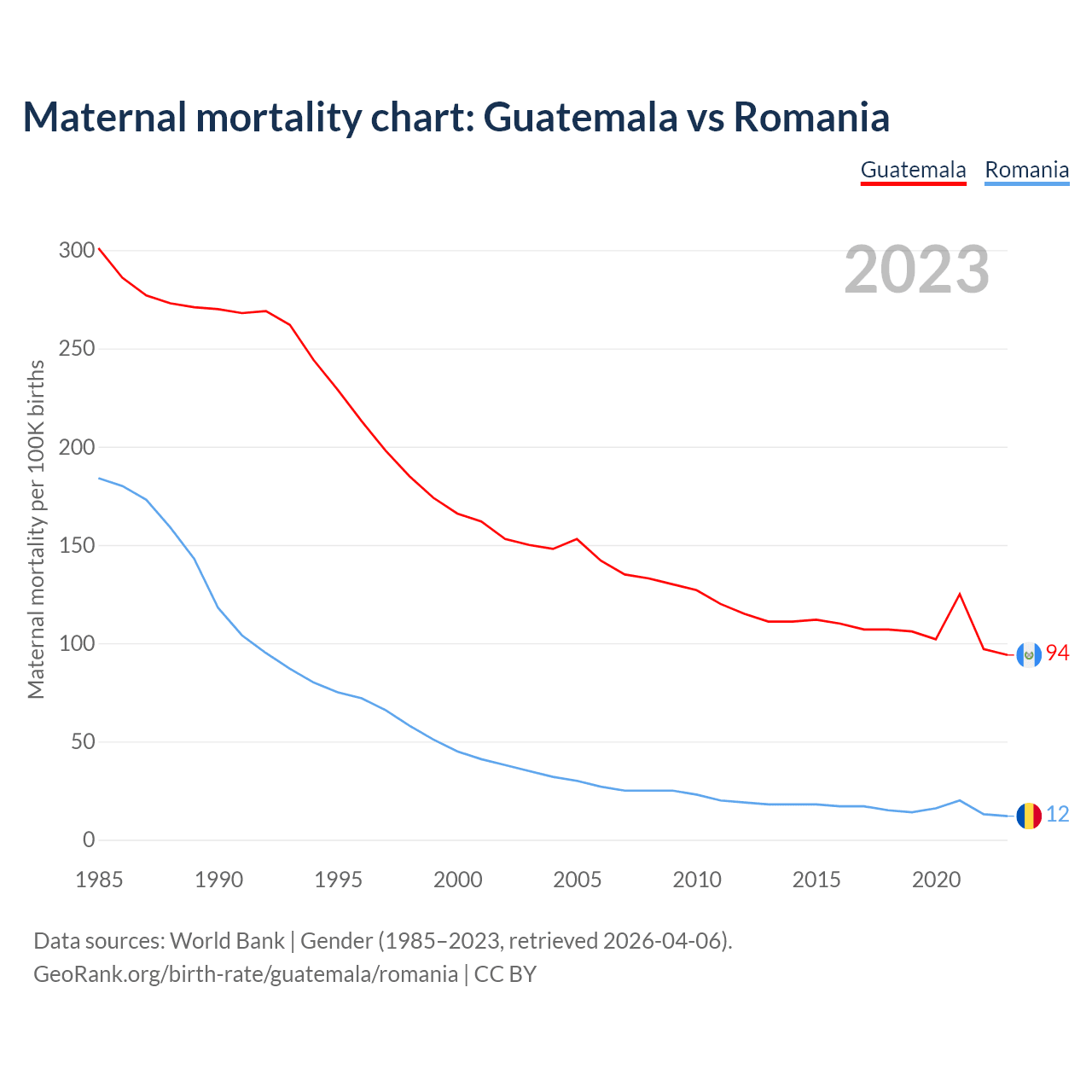 The maternal mortality rate, which is the probability of dying during childbirth or within 42 days of pregnancy termination, is 94 deaths per 100,000 live births in Guatemala, compared to 12 deaths in Romania.