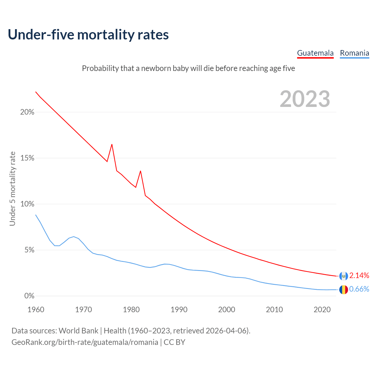 The chance that a newborn baby will die before reaching age five is 2.14% in Guatemala and 0.66% in Romania. Above is a chart with historical data on under-five mortality rates.