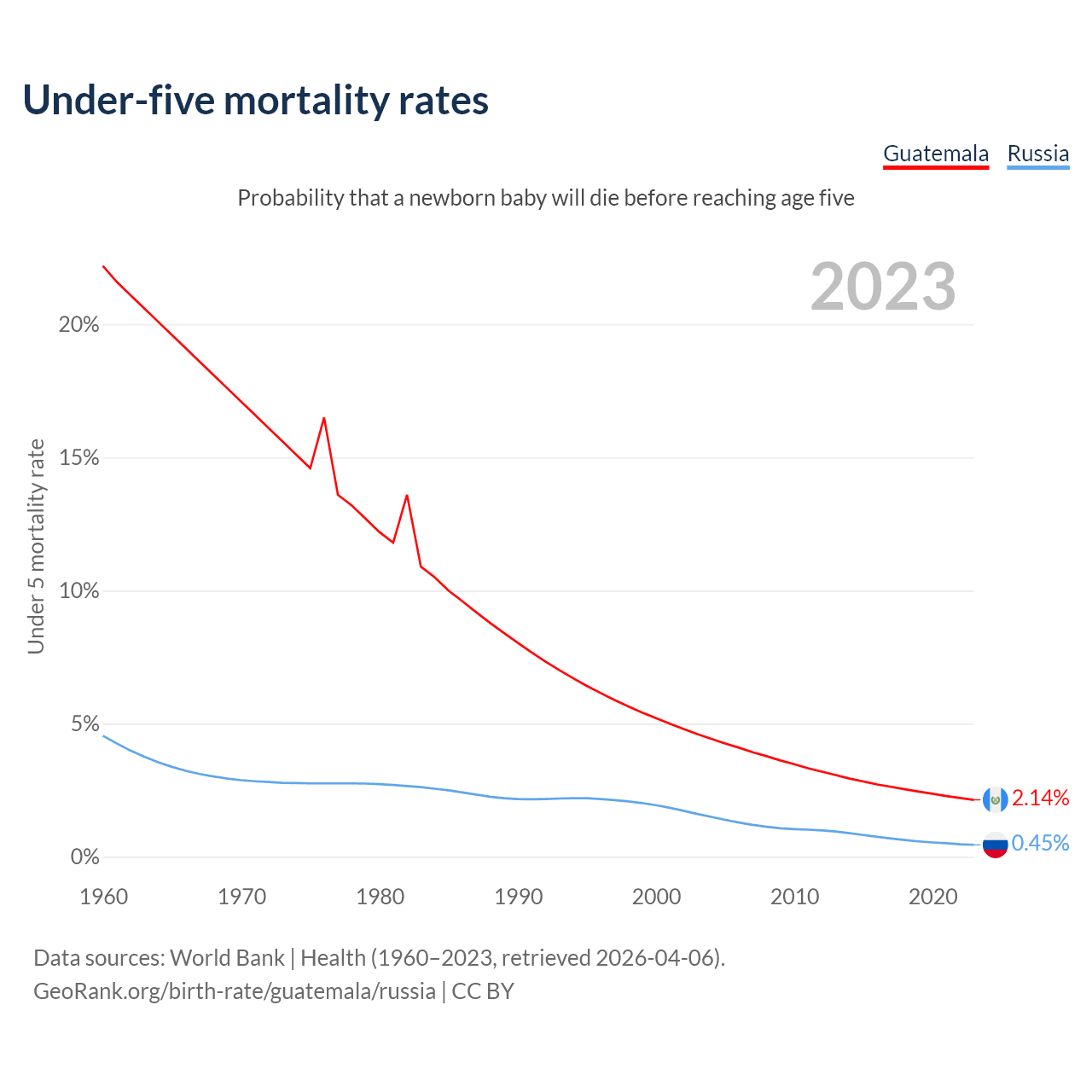 The chance that a newborn baby will die before reaching age five is 2.14% in Guatemala and 0.45% in Russia. Above is a chart with historical data on under-five mortality rates.