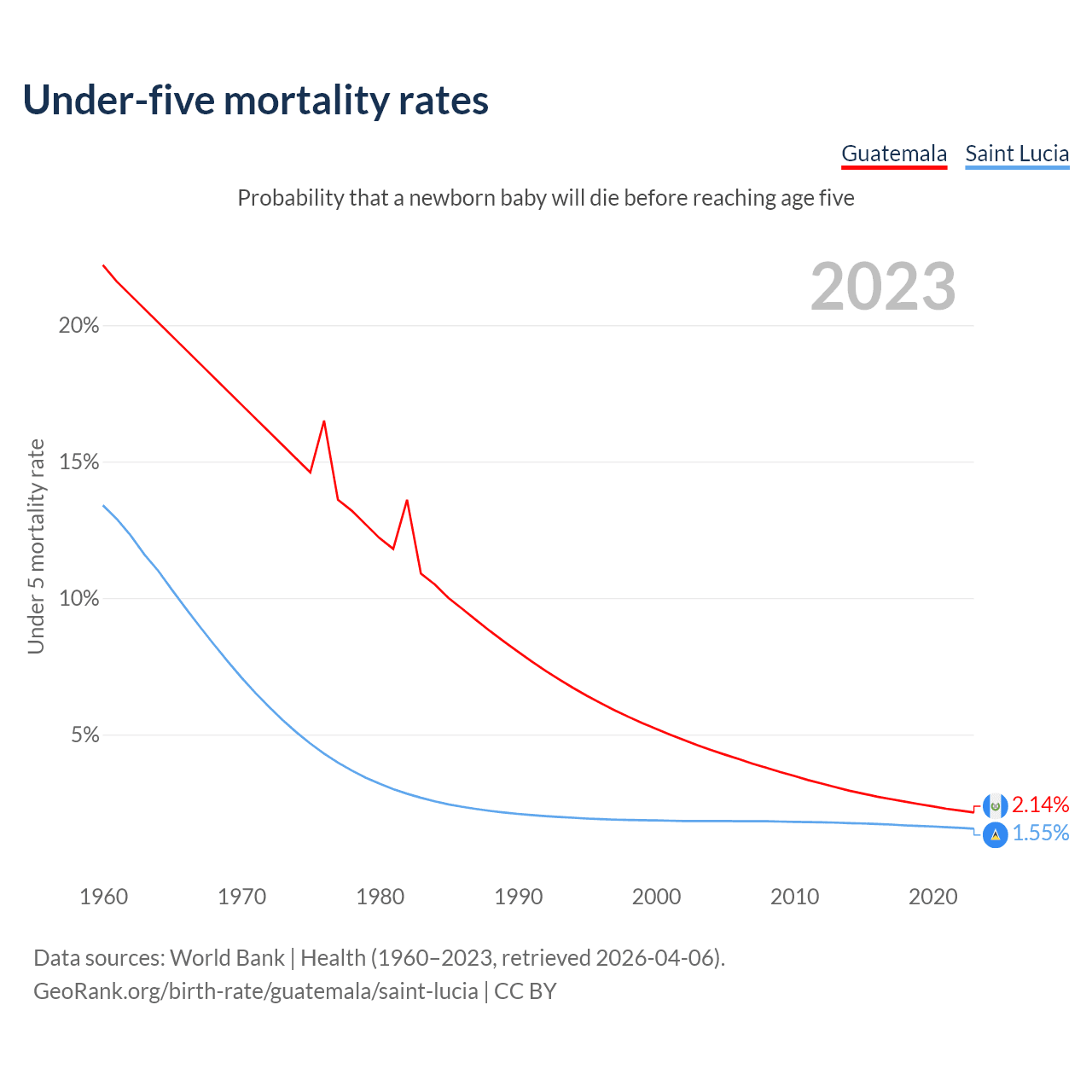 The chance that a newborn baby will die before reaching age five is 2.14% in Guatemala and 1.55% in Saint Lucia. Above is a chart with historical data on under-five mortality rates.