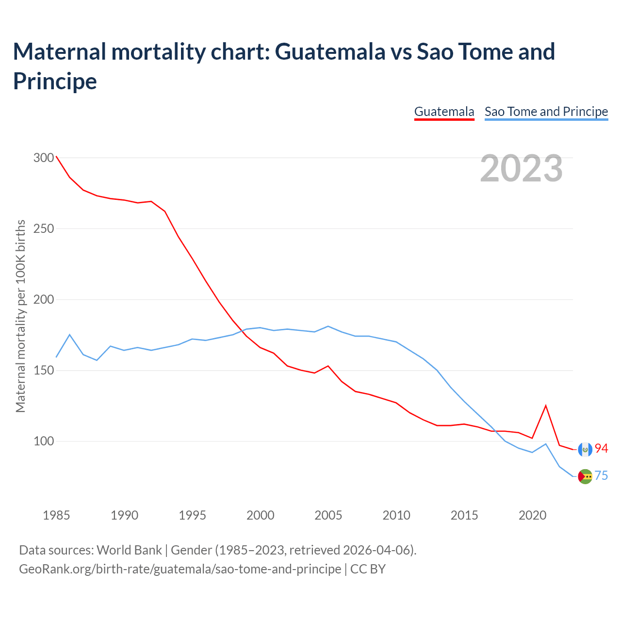 The maternal mortality rate, which is the probability of dying during childbirth or within 42 days of pregnancy termination, is 94 deaths per 100,000 live births in Guatemala, compared to 75 deaths in Sao Tome and Principe.