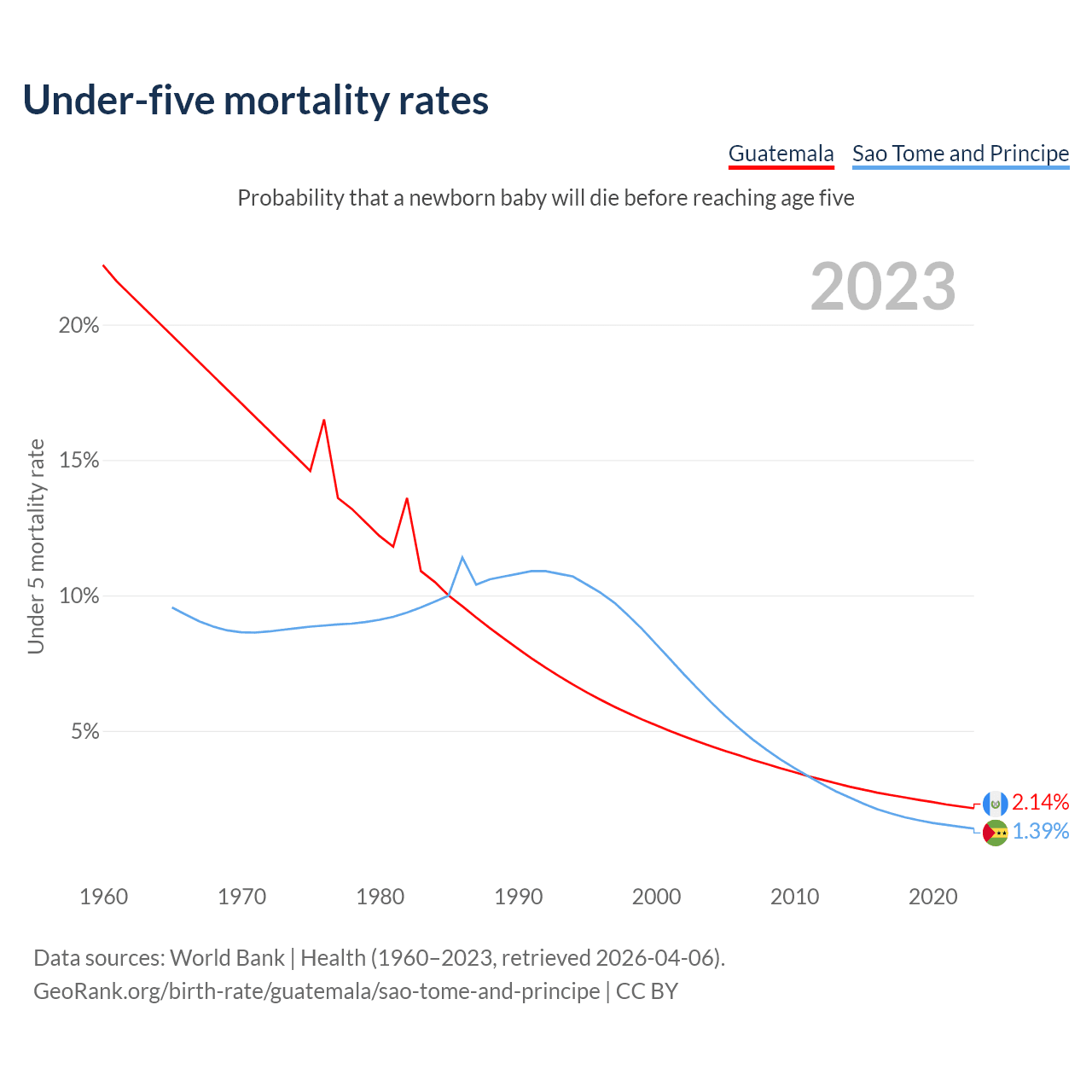 The chance that a newborn baby will die before reaching age five is 2.14% in Guatemala and 1.39% in Sao Tome and Principe. Above is a chart with historical data on under-five mortality rates.