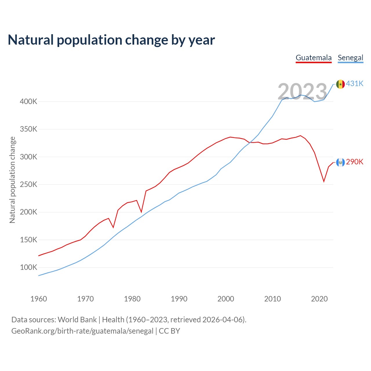 Guatemala has an annual birth rate of 20.8 births per 1,000 people, compared to 29.4 for Senegal. The average number of children a woman is expected to have during her lifetime — the fertility rate, is 2.31 in Guatemala and 3.82 in Senegal — 65.2% difference.