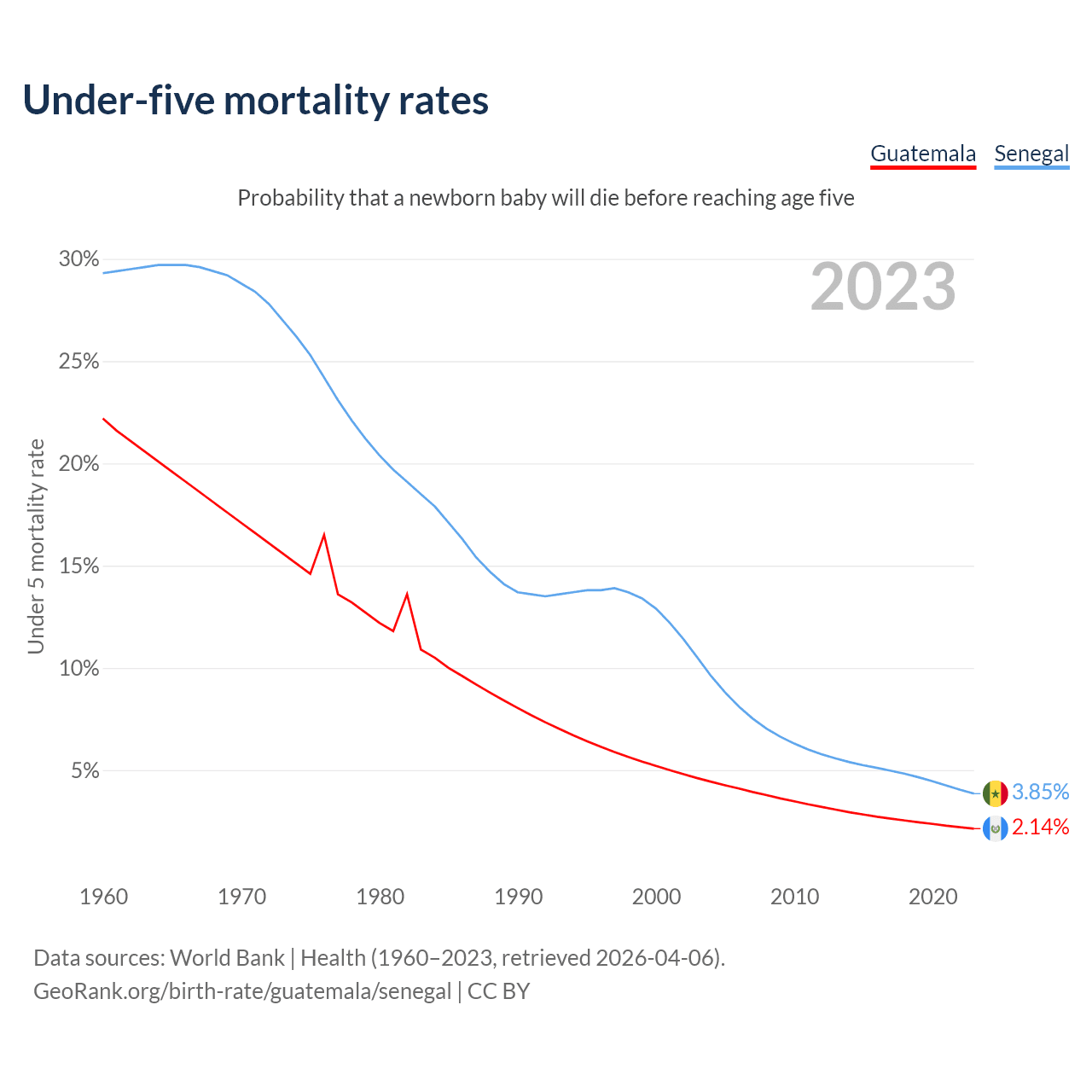 The chance that a newborn baby will die before reaching age five is 2.14% in Guatemala and 3.85% in Senegal. Above is a chart with historical data on under-five mortality rates.