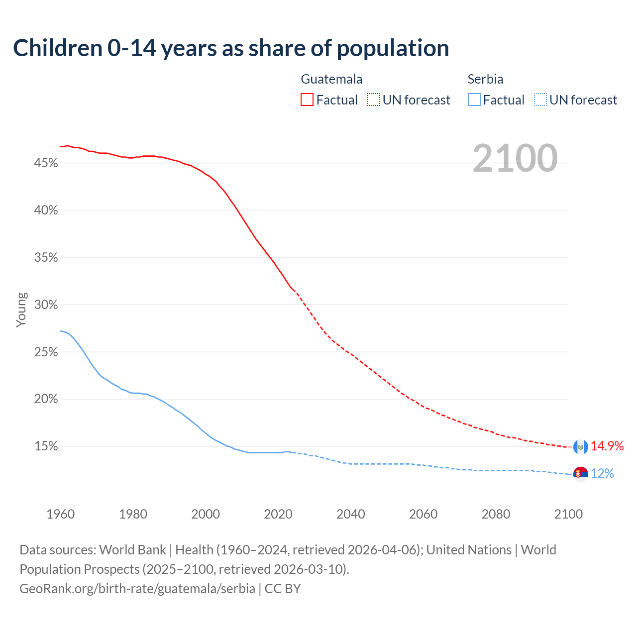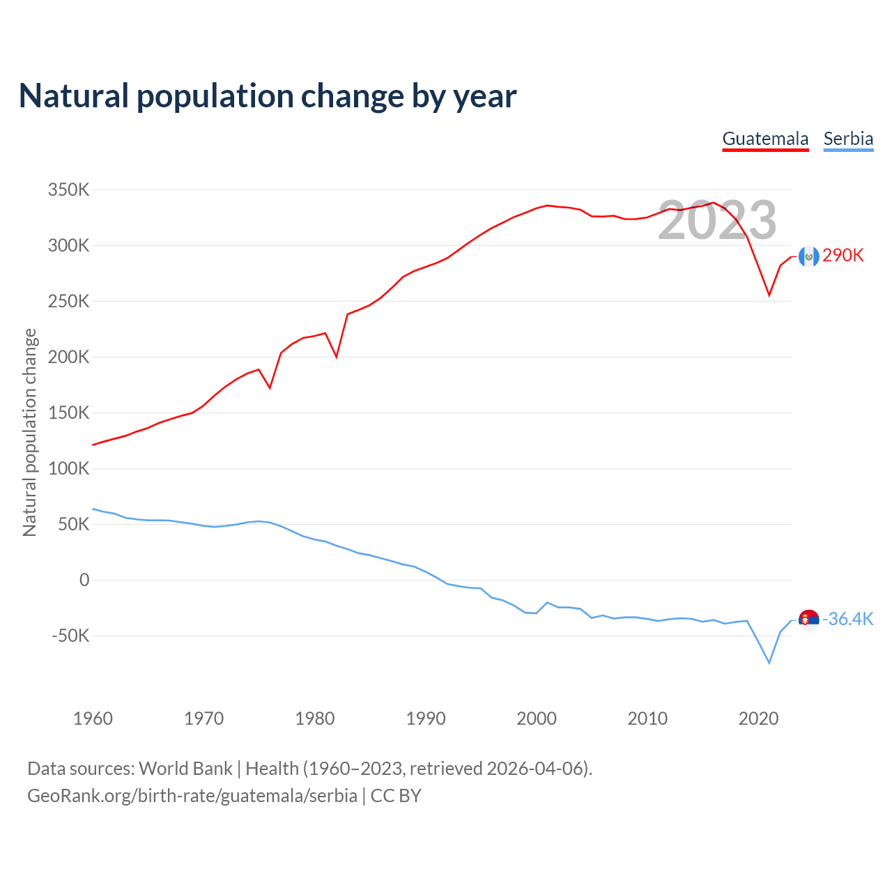 According to the latest available data on birth rates, the fertility rate in Guatemala was 2.31 children per woman in 2023, compared to 1.61 in Serbia in 2023. The replacement level is considered to be 2.1 children per woman.