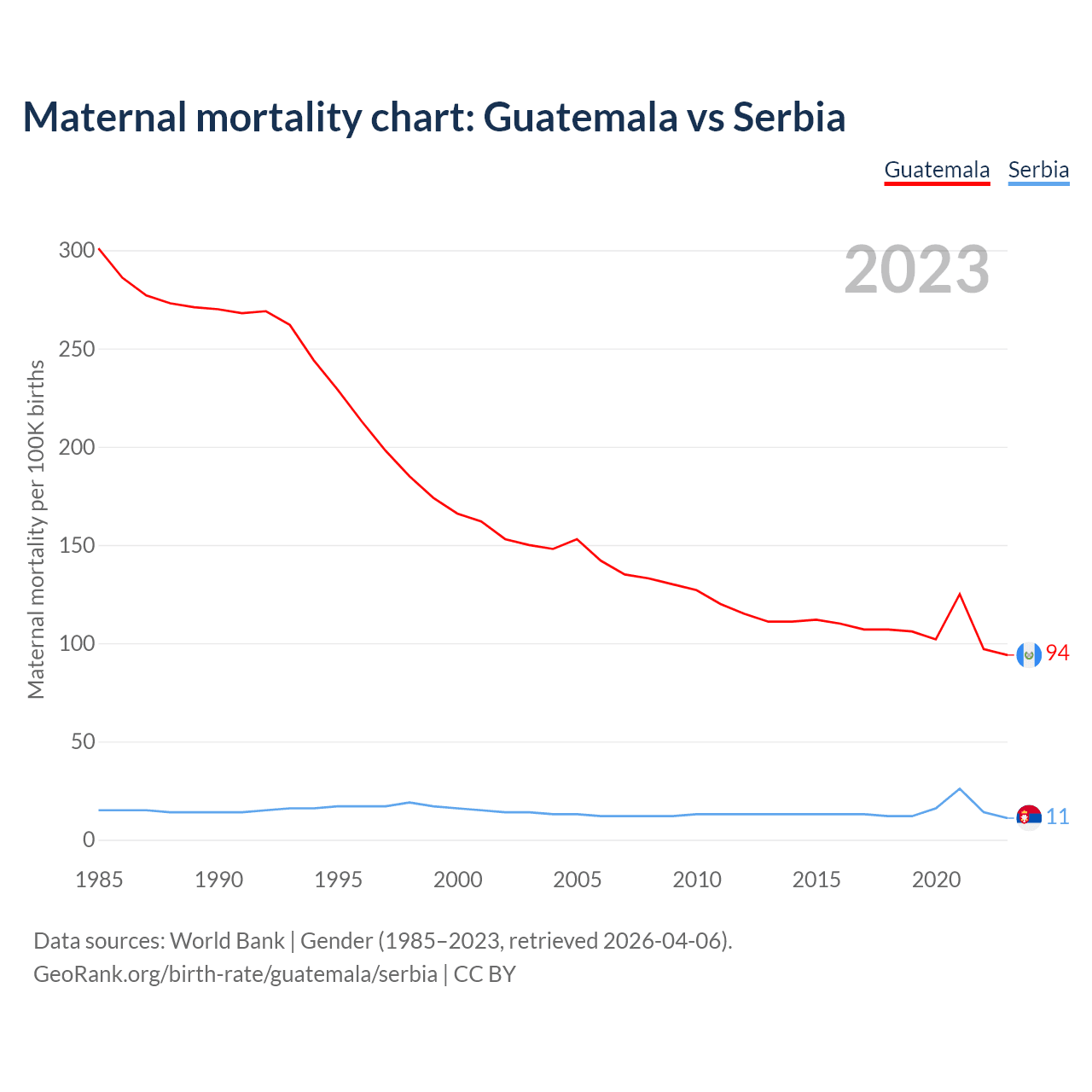 The maternal mortality rate, which is the probability of dying during childbirth or within 42 days of pregnancy termination, is 94 deaths per 100,000 live births in Guatemala, compared to 11 deaths in Serbia.